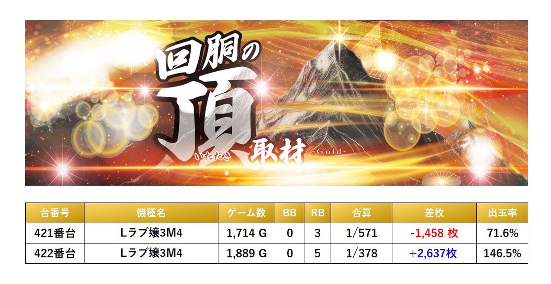 「ラブ嬢」をpick upする。2台の平均差枚は+590枚で平均出率は110.9%だった。