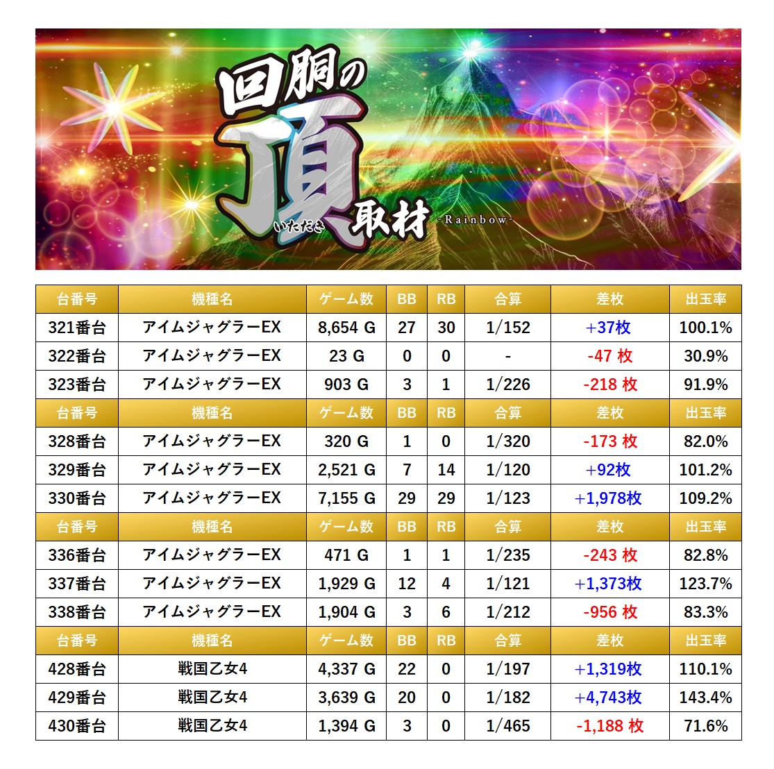 「アイムジャグラー」「戦国乙女4」に3台並びを4箇所見つけることができた。4箇所の平均差枚は+560枚で平均出率が106.7%だった。