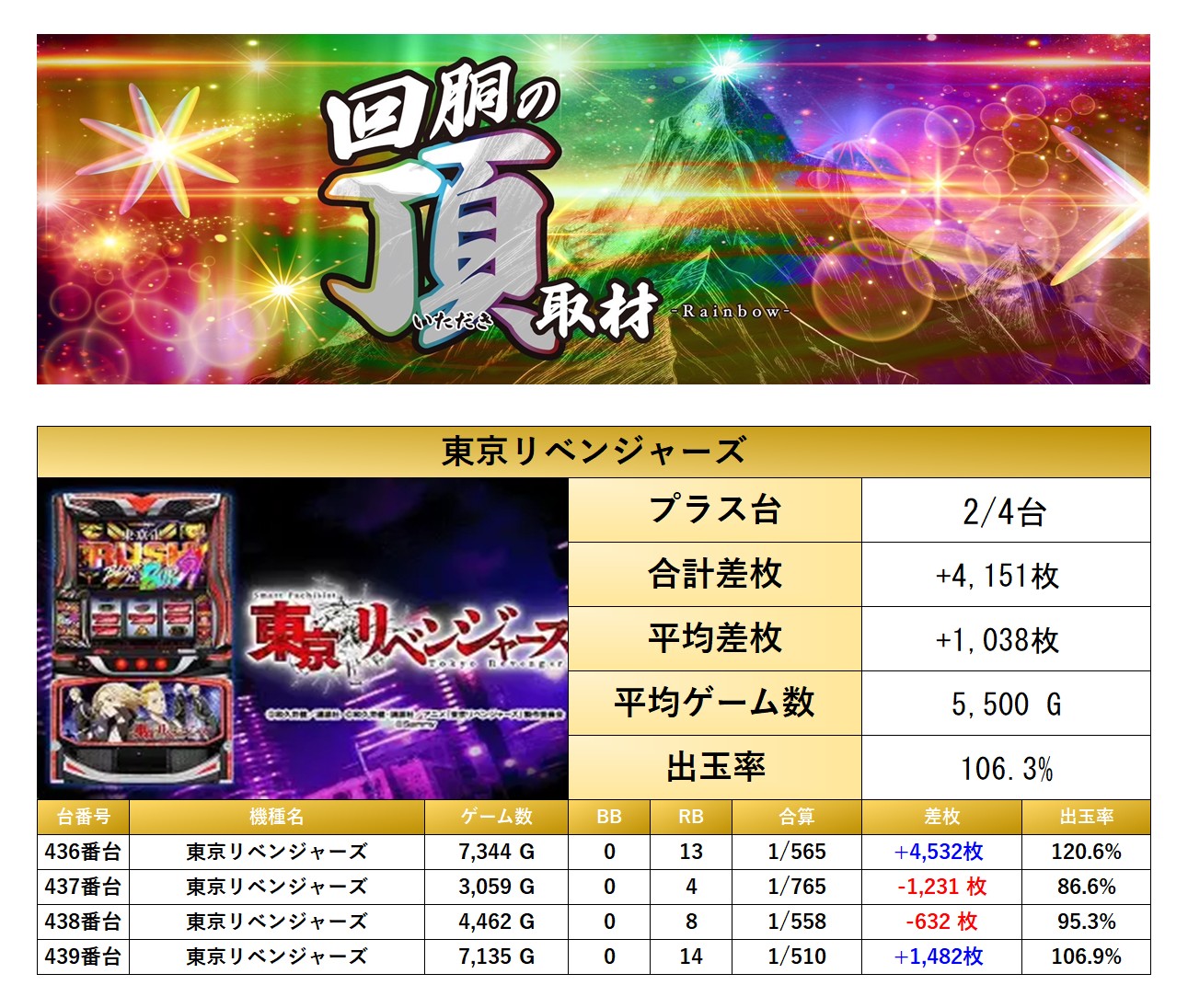 「東京リベンジャーズ」の1機種をpick upする。1機種4台の平均差枚は+1,038枚で平均出率が106.3%と安定した出玉だった。