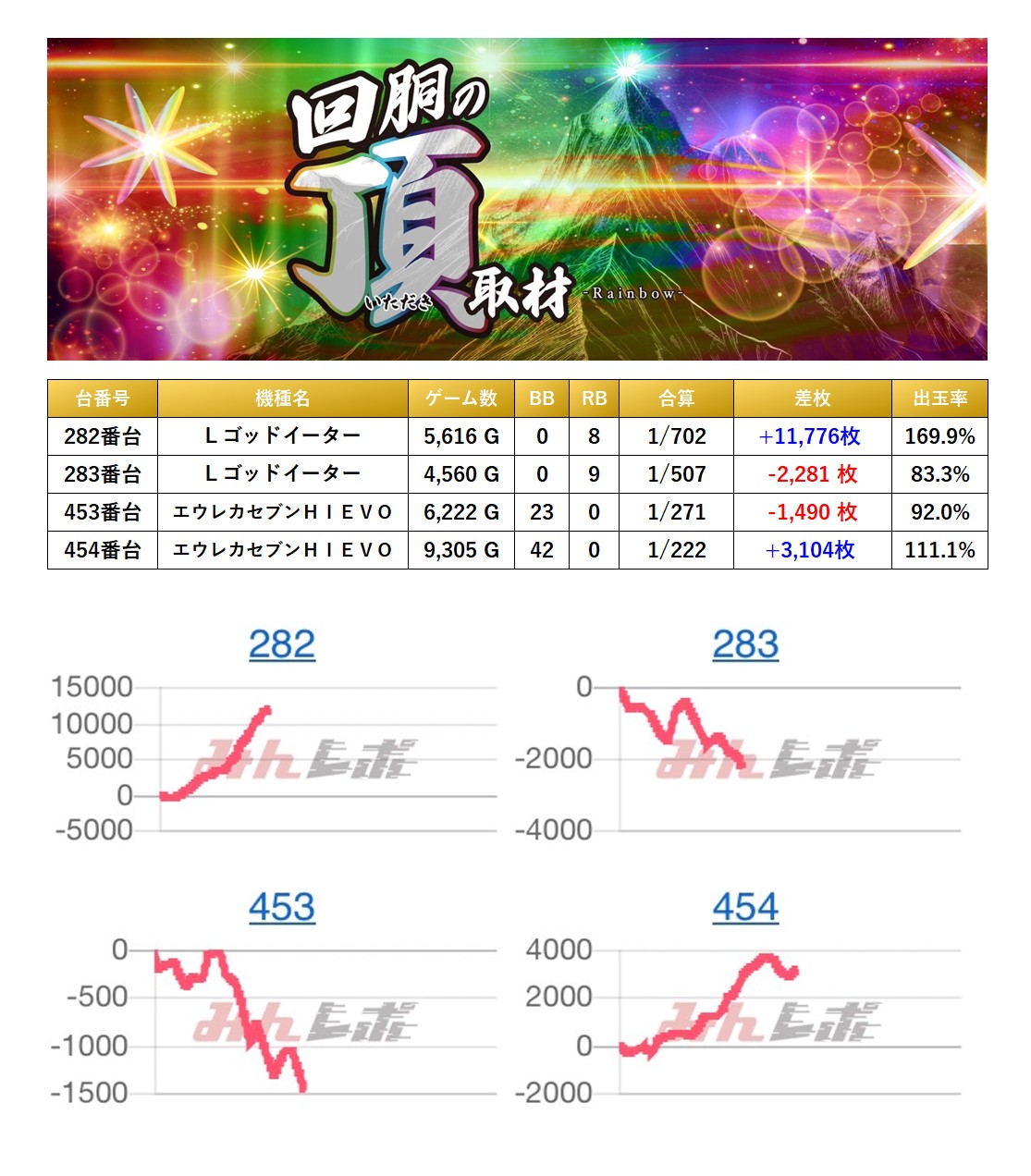 4台の平均差枚は+2,777枚で平均出率が114.4%だった。