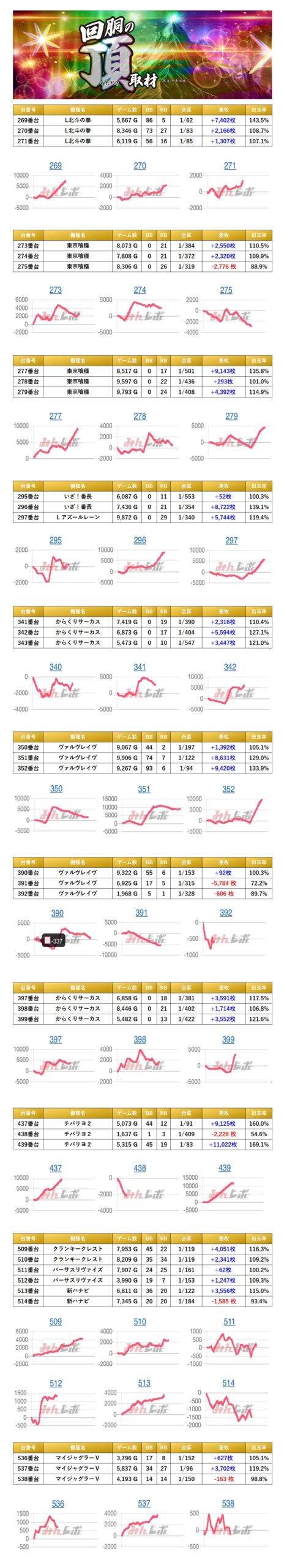 11箇所36台の平均差枚は+2,956枚で平均出率が113.9%だった。