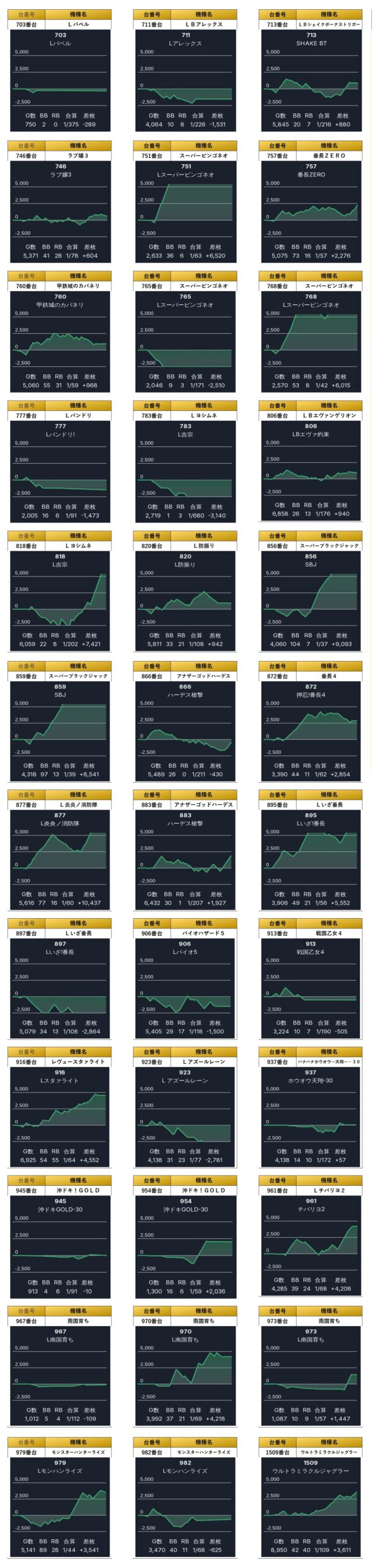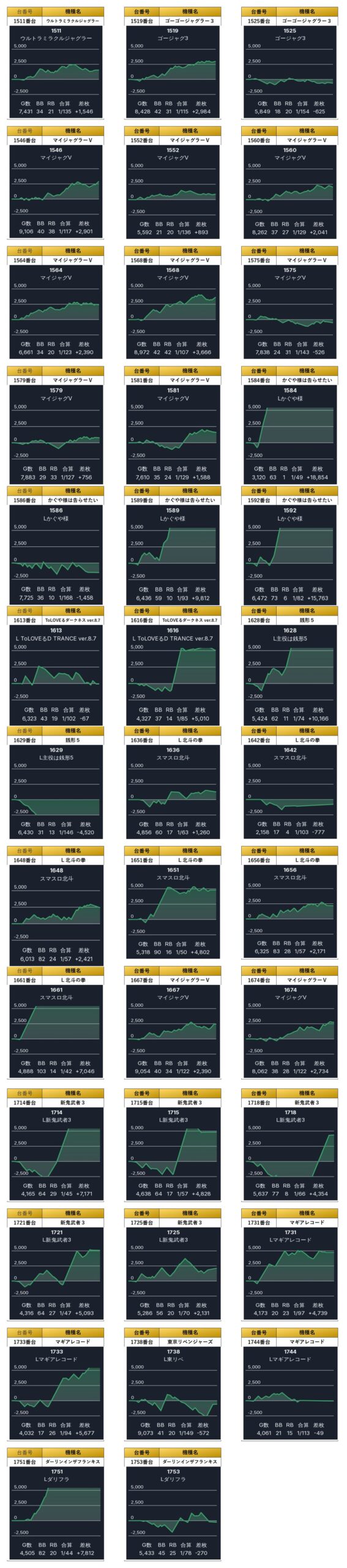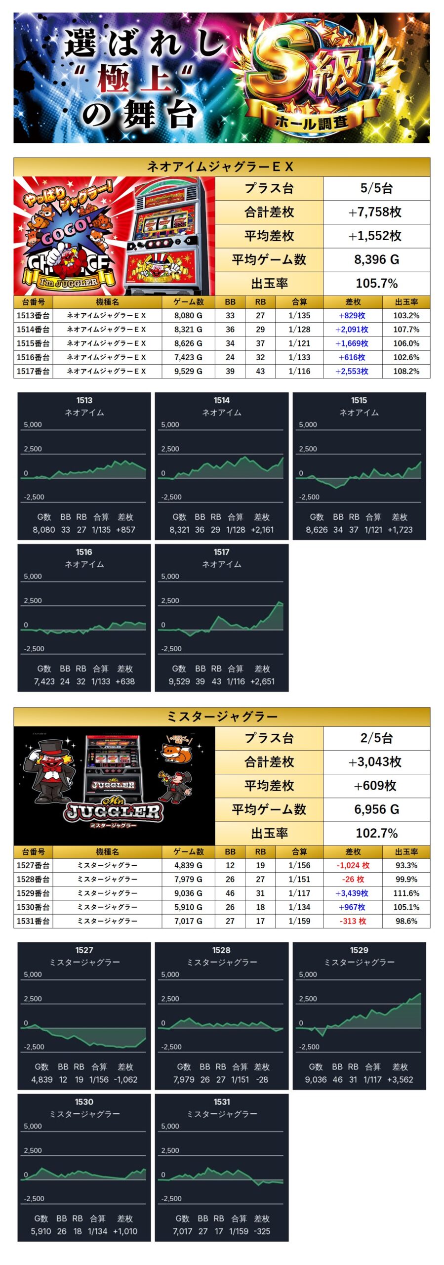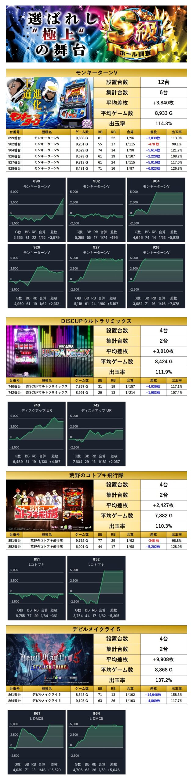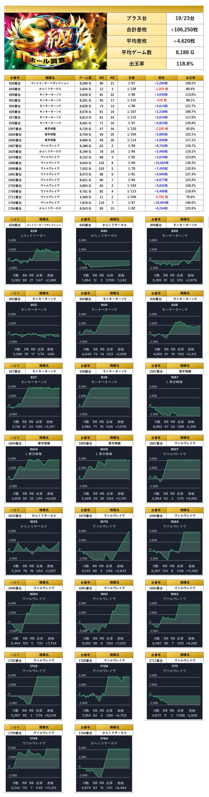 平均差枚は+4,478枚で平均出率が117.2%と、どの台も高水準で素晴らしい結果だった。