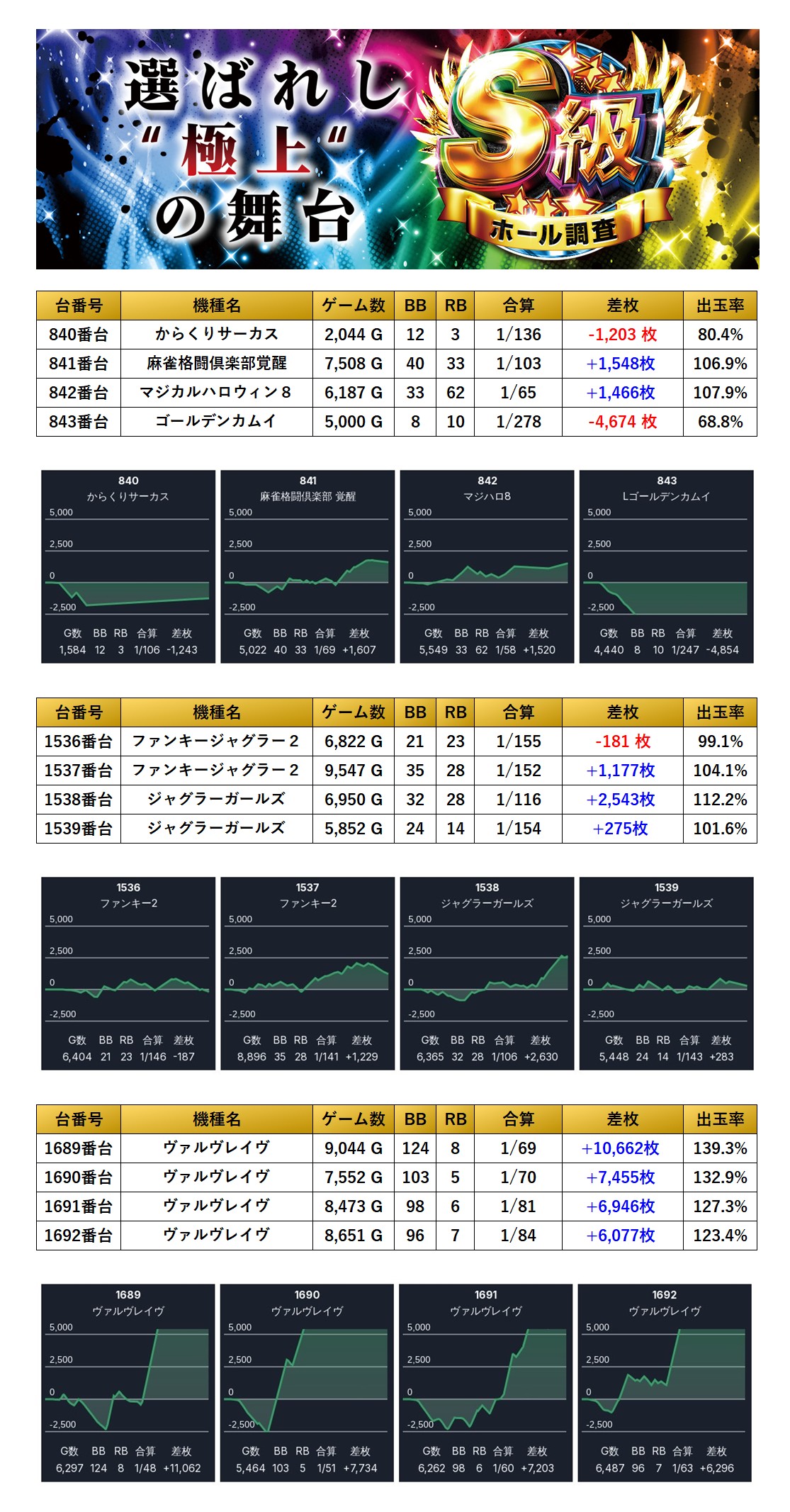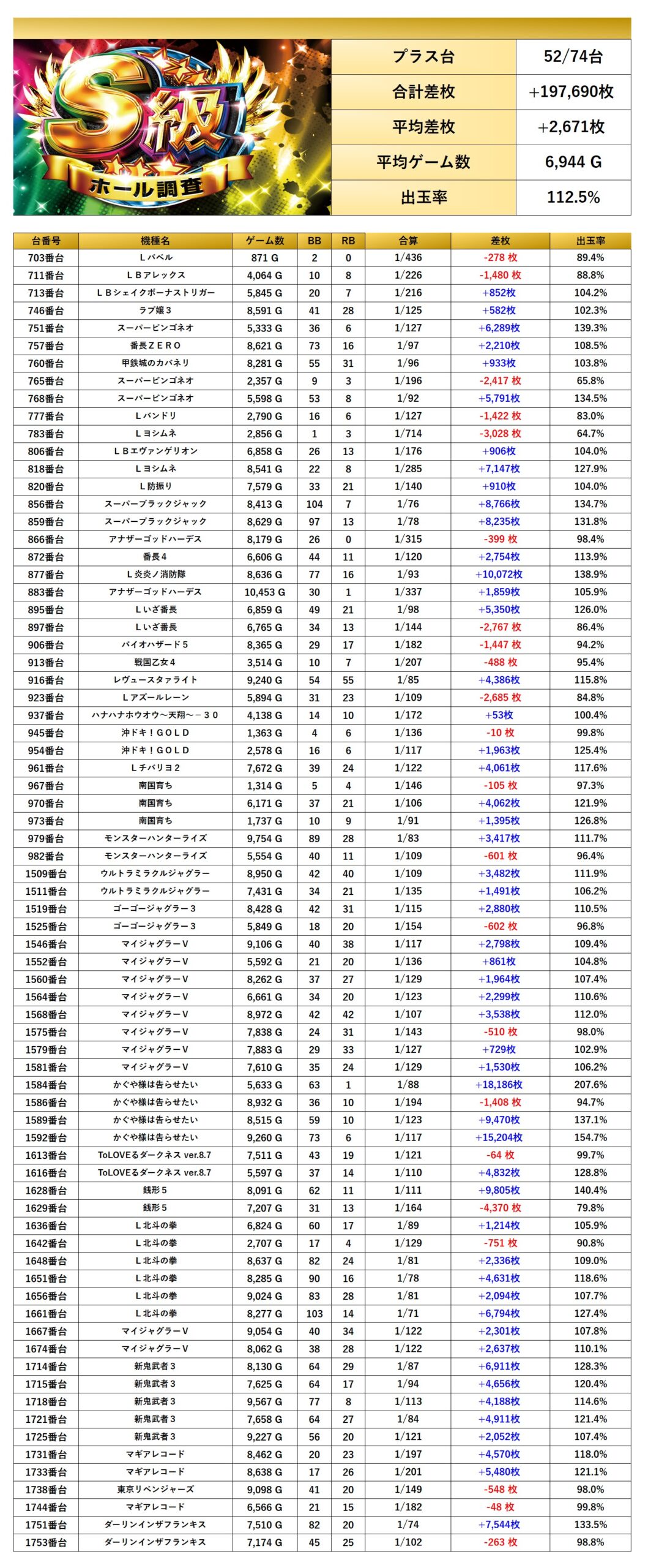 10回目となったS級調査-虹-は今回も爆発的な出玉と仕掛け量でpick up台の総差枚はなんと+347,583枚/平均出率+2,897枚と素晴らしい成績を残してくれた。さらに朝から抽選386名/一般423名と設置台数561台を超えるユーザーが集まてくれた。今回は21.3%のpick up率となり、仕掛け量だけでなく出玉でもユーザーの期待に応える結果となった。個別にみると、「メイン機種」、「半分が好調な台」はどちらも出率115%を超えている。「全台系」ではジャグラーシリーズがpick upされしっかり打ち込まれていた。「4台以上並び」は4台並び3箇所の計12台pick upされヴヴヴは全台がプラス域と高水準の仕掛けになっていた。「4台設置以上機種」からは68台ものpick upとなった。仕掛けの量と質は素晴らしい結果だ。今回も圧倒的な結果を残してくれたが全体の出玉が少し足りず惜しくも分岐を超えれず、今回は二つ星評価となった。次回の調査では三つ星に返り咲いてほしい。期待をしている。