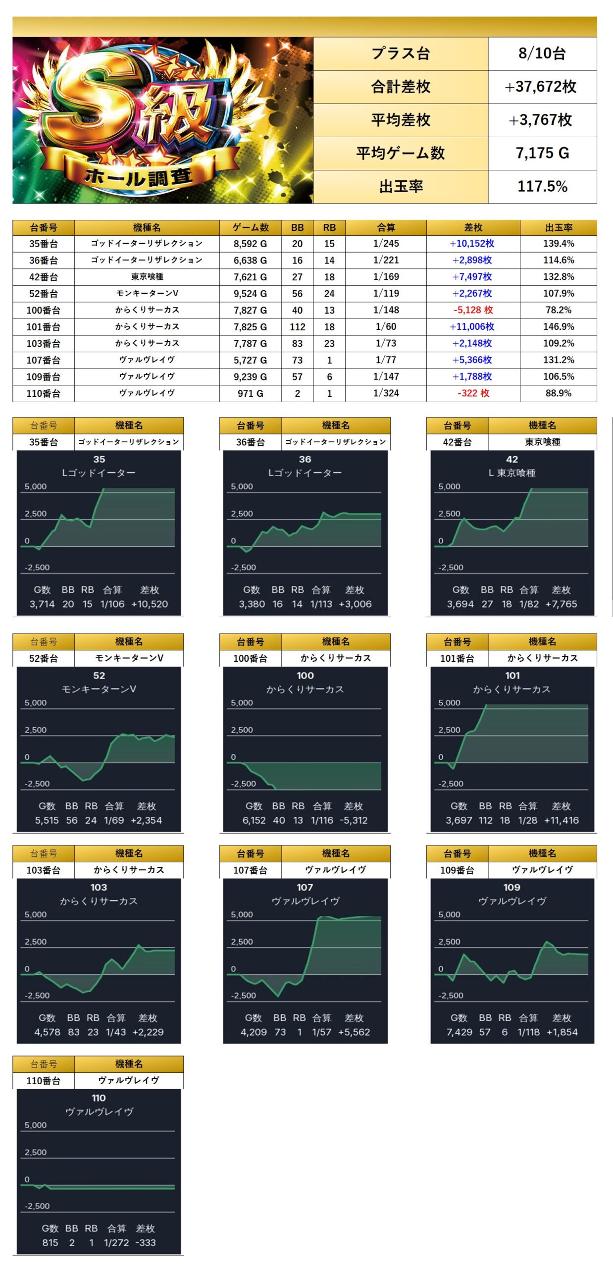 平均差枚は圧巻の+3,767枚、出率117.5%とインパクトのある仕掛けとなった。