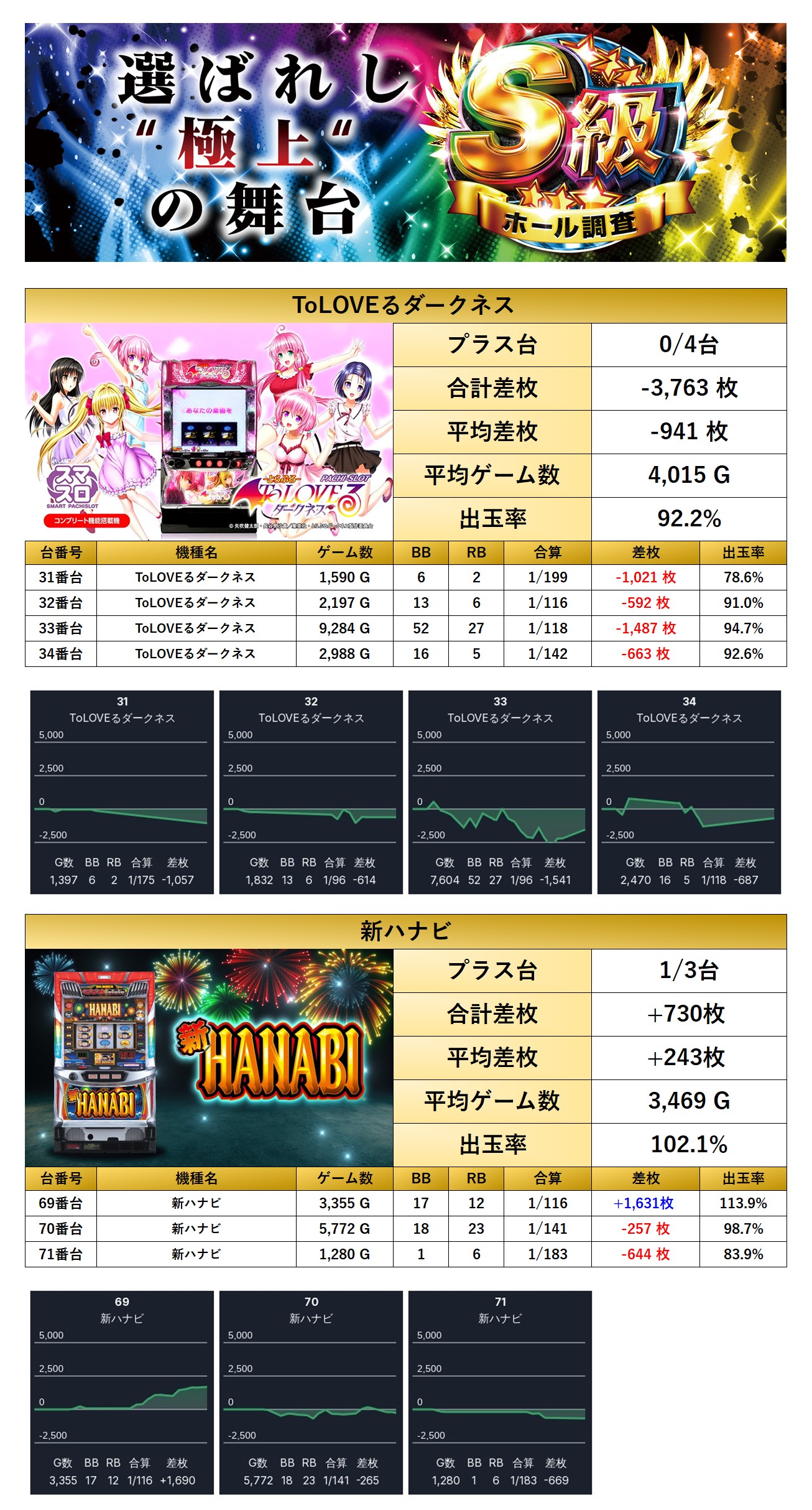 4回目開催となったBIGディッパー新橋2号店でのS級‐虹‐調査は、店内全体の19.5%がpick upとなった。総差枚+2,153枚/平均+12枚とプラスにはなっているものの、三つ星には届かず惜しい結果となったがメイン機種・ニブイチ機種の爆発力が際立つ結果となった。4台設置機種からも良好なデータが確認され、ホール全体に多彩な仕掛けが広がっていた印象だ。