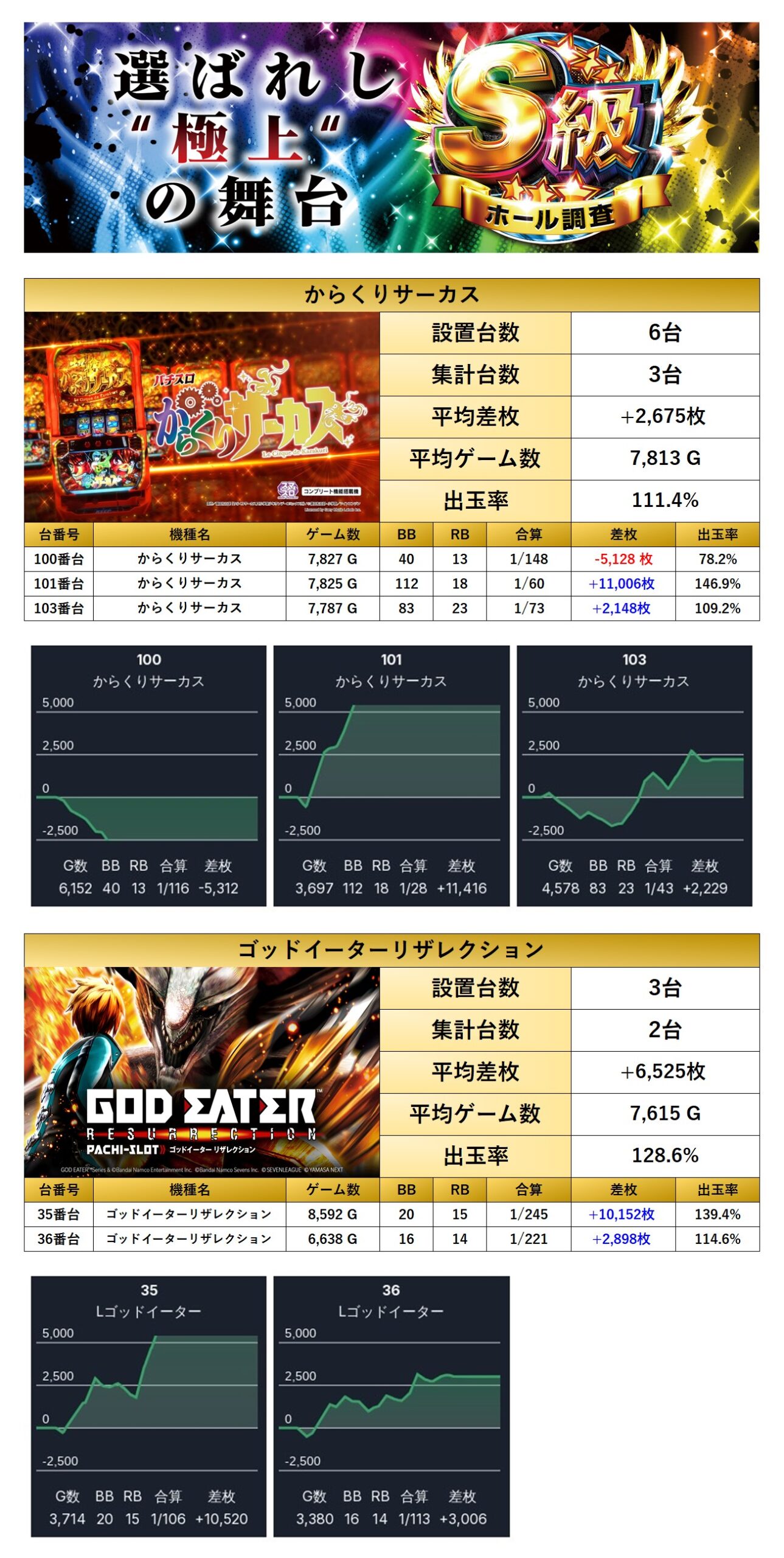 平均差枚+442枚、出率104.4%と局所的な盛り上がりを見せた。