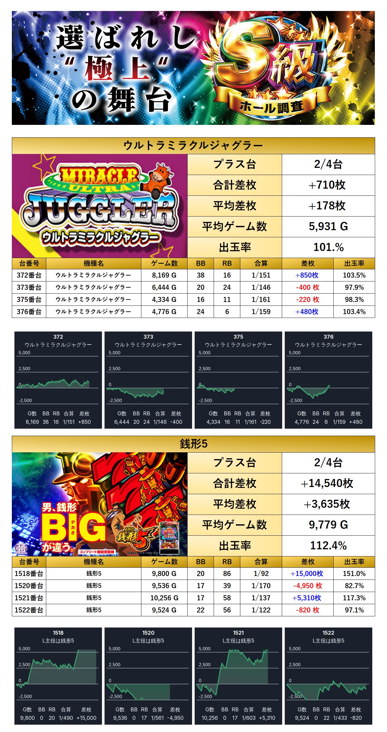 「ウルトラミラクルジャグラー」「銭形5」の2機種計8台をpick upする。平均差枚は+1,906枚で平均出率が108.1%だった。