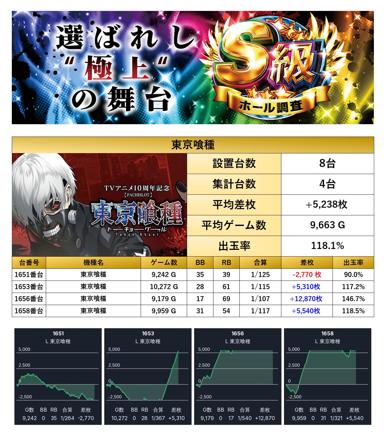 「東京喰種」が設置の半分以上の最優秀台としてpick upする。1機種4台の平均差枚は+5,238枚で平均出率が118.1%と優秀な結果だった。