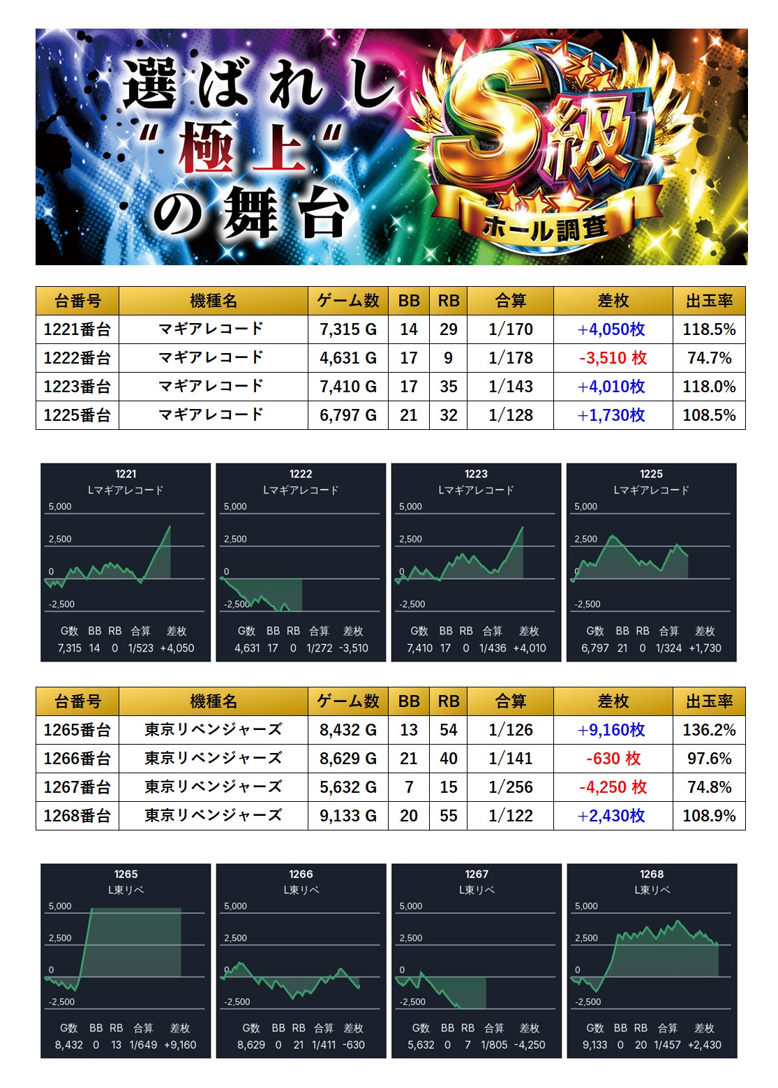 「マギレコ」「東京リベンジャーズ」の人気機種4台並びが計2箇所で発見された。8台の平均差枚は+1,624枚で平均出率が107.5%となった。