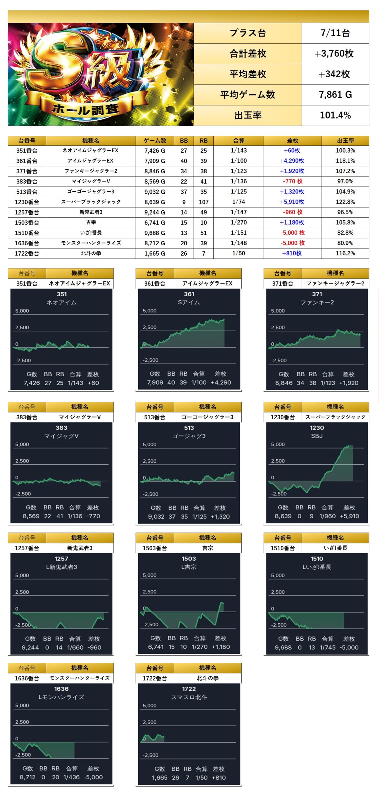 ノーマル機、メダルAT機、スマスロのあらゆる機種から11台をpick upする。11台の平均差枚は+342枚で平均出率が101.4%だった。