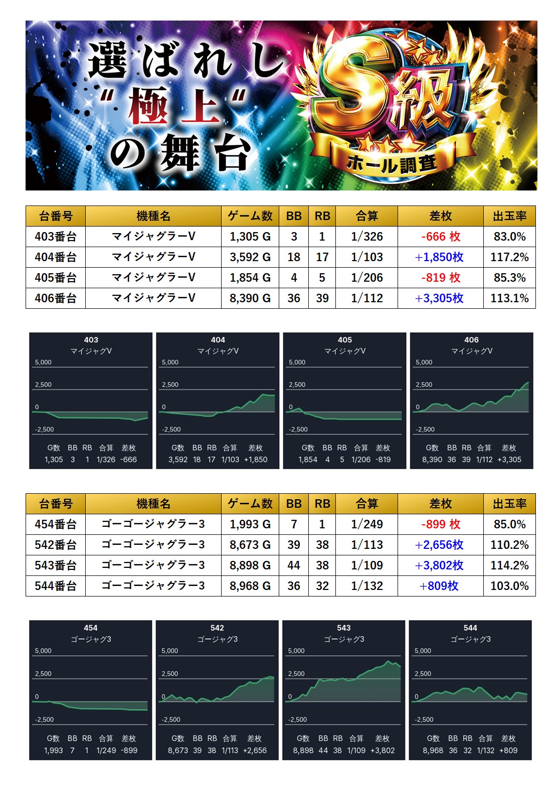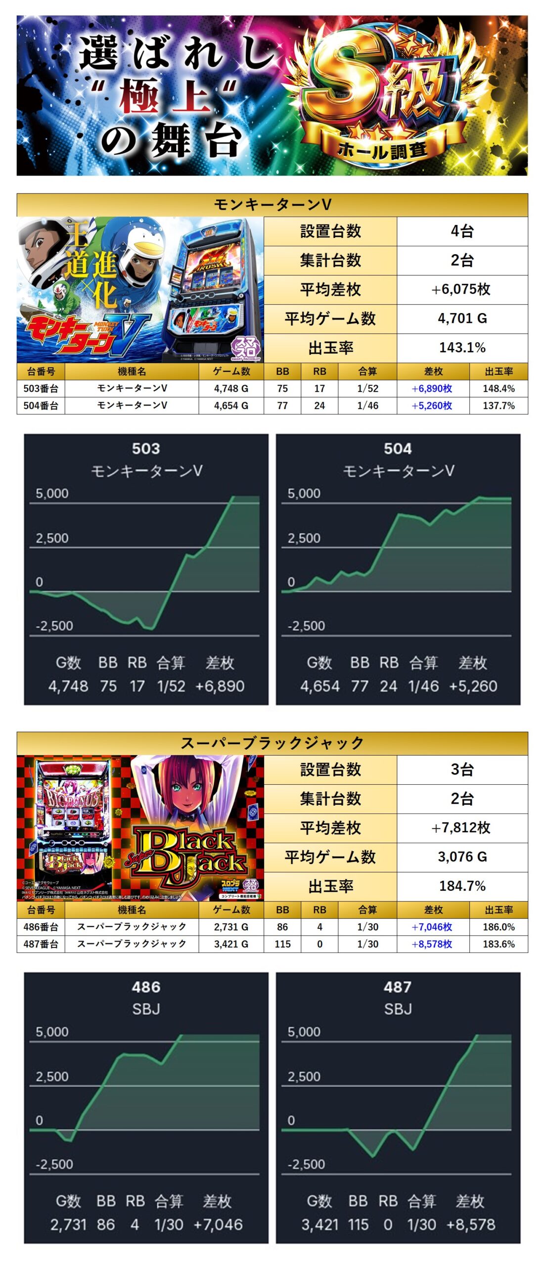 メイン機種の「モンキーターンV」、さらに「スーパーブラック」からはニブイチ仕掛けが見られ、平均差枚+6,944枚/出率159.5%と抜群のインパクトを放った。爆発力の高さが際立ち、ユーザーの注目を集めた。