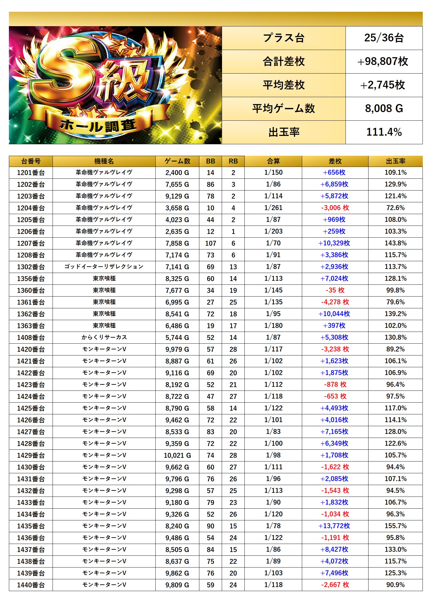 平均差枚は+2,745枚で平均出率が111.4%となりメイン機種らしい圧巻の出玉を誇った。