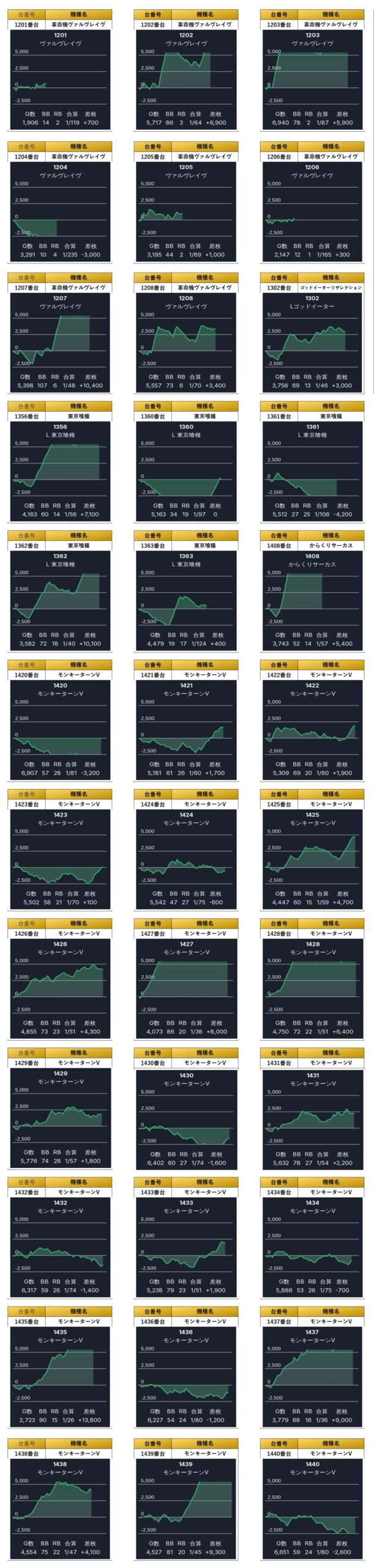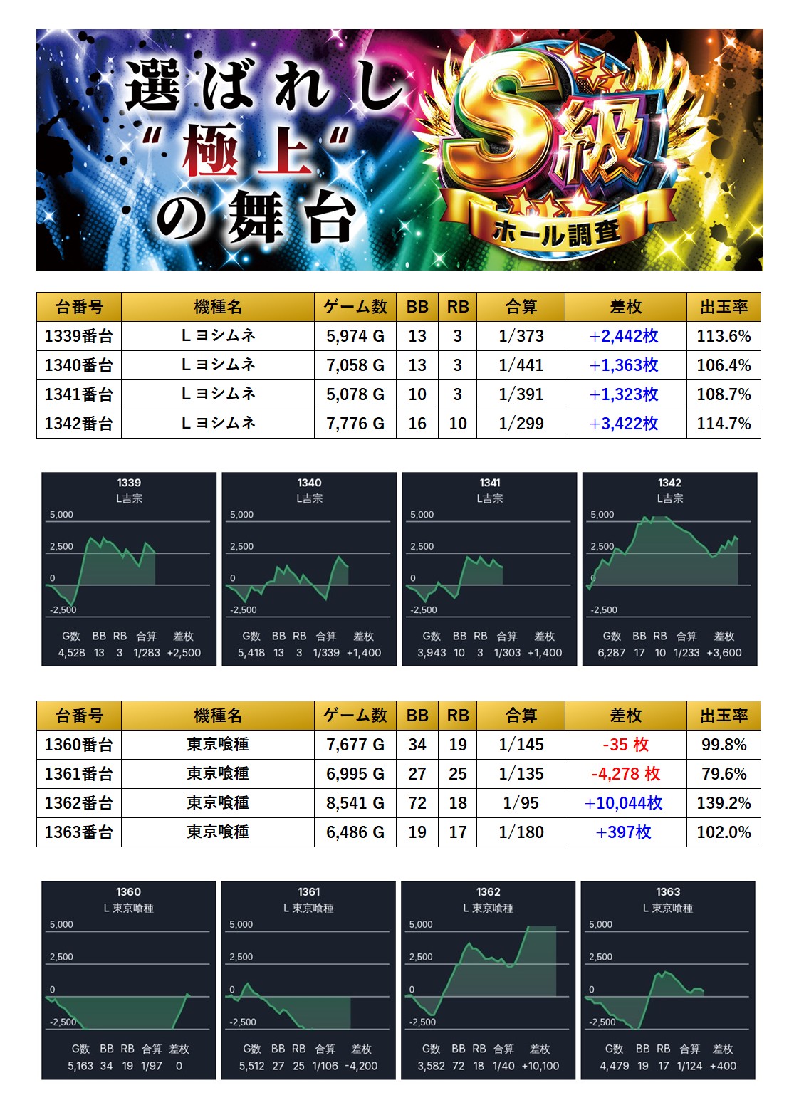 平均差枚は+2,625枚で平均出率が111.5%と万枚OVERが2台と圧巻な出玉を誇った。