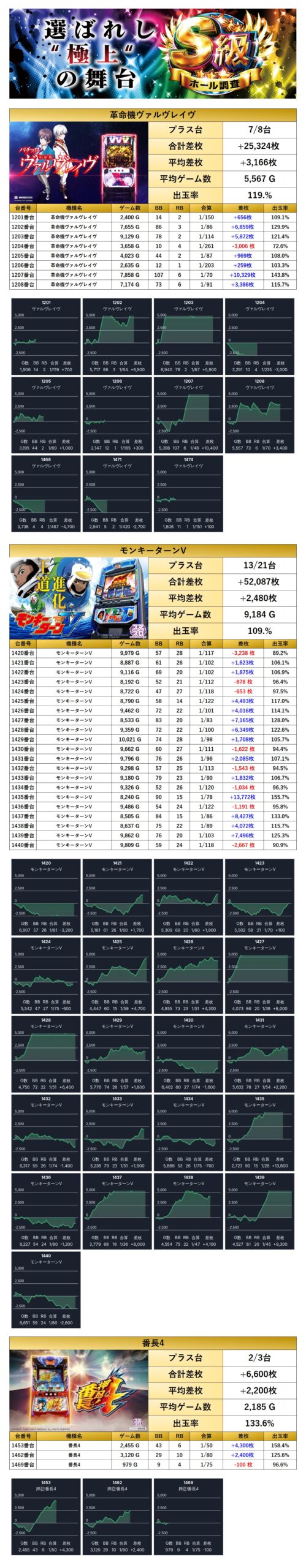 初開催となったS級調査-虹-は仕掛け全体を見ると設置台数の15.8%がpick upとなった。個別にみると「メイン機種」では平均差枚+2,745枚と優秀な結果だった。「全台が好調な機種」は3機種pick up、「並び仕掛け」では4台並びが2箇所pick up、「4台設置機種」は計29台もをpick upとなりユーザーがしっかり探せる仕掛けになっていた。多彩な仕掛けが随所で確認され、要所では見ごたえのある結果を残した。安定した仕掛け量と質で出玉もよかったが、あともう一歩のところで三つ星に届かず今回は二つ星評価となる。次回も期待している。