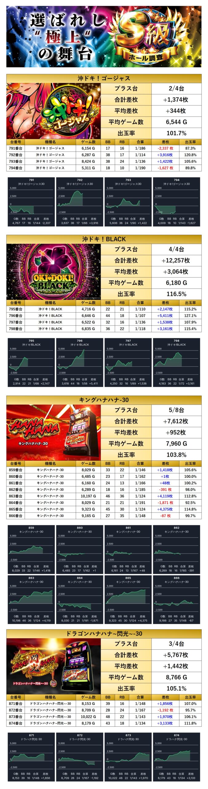「沖ドキ!ゴージャス」「沖ドキ!BLACK」「キングハナハナ」「ドラゴンハナハナ」の4機種20台の沖スロをpick up。