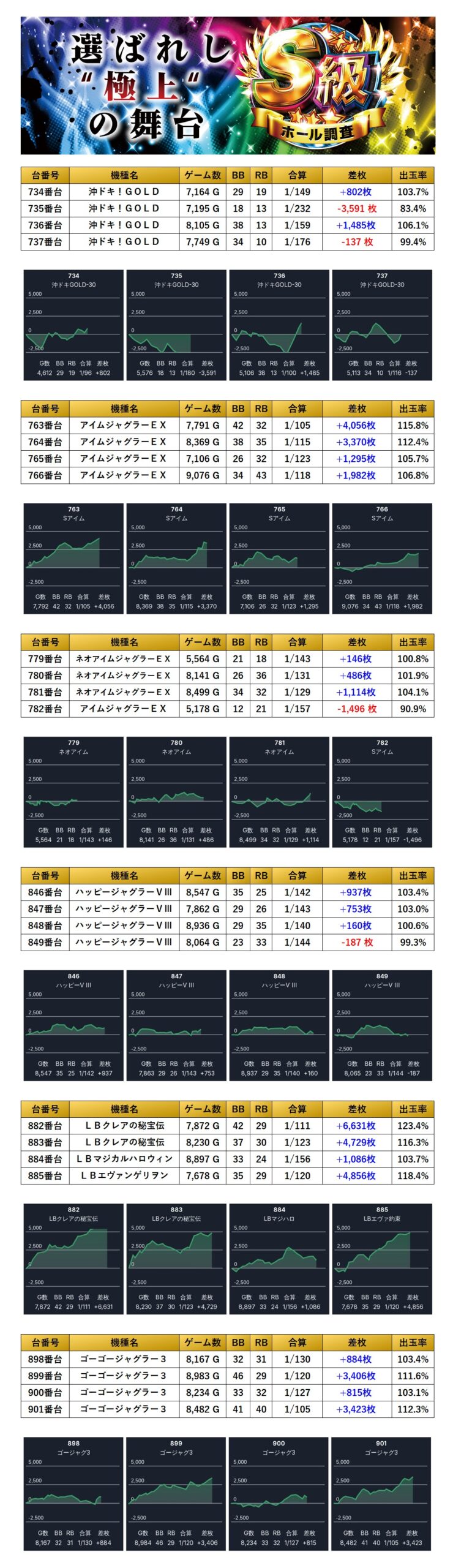 7回目となったS級‐虹‐はまず「メイン機の仕掛け」から出率の高さが素晴らしい。ここから他の仕掛けに目を向けるとゲーム数がほぼ全台しっかり入り追える状況があったことが分かる。さらに全台系ではノーマル機の出率がしっかり高く綺麗な右肩上がりのグラフを描いている。店内全体で総差枚+113,477枚/平均+301枚と店内はお祭り騒ぎだった事が伺える。堂々と不足なしの三つ星にふさわしい一日となった。今回で2連続で三つ星獲得となった。次回の調査でも期待が膨らむ。