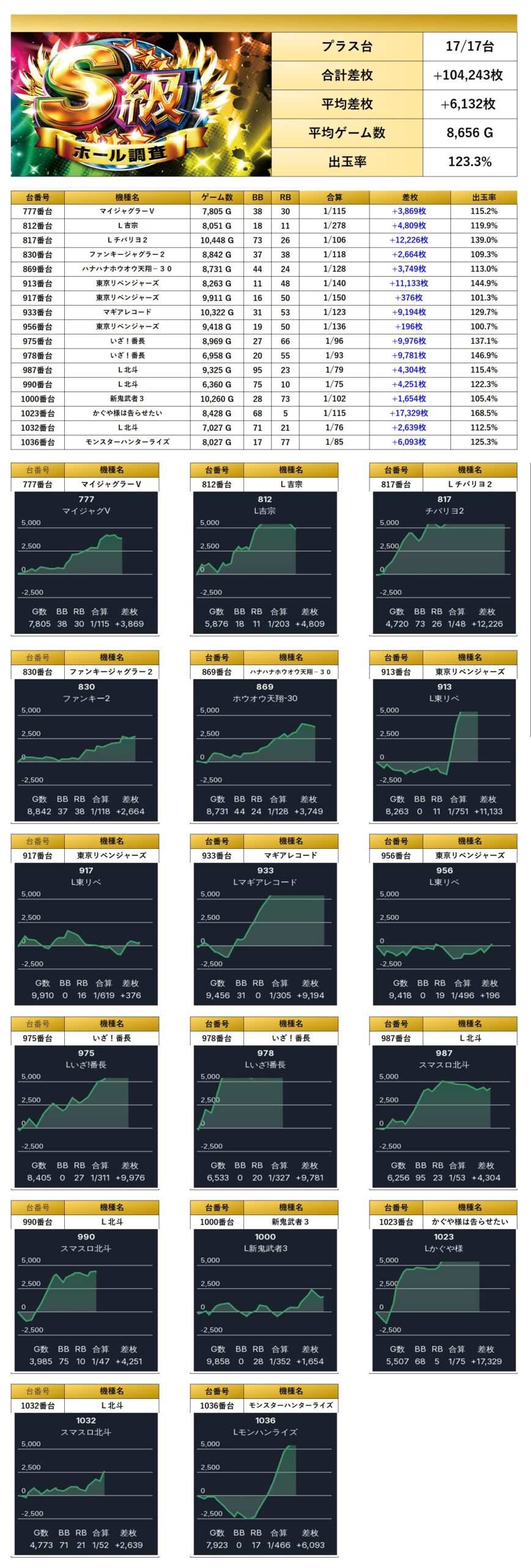 平均差枚+6,132枚、平均出率123.3%と素晴らしい出率となった。単品で散っている台17台の平均ゲーム数が8,000Gを超えてくるのは質の高さがあってこそだろう。