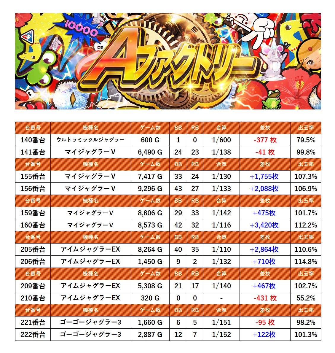 2台並びを6箇所12台をpick up。12台の平均差枚は+913枚で平均出率が105.5%だった。