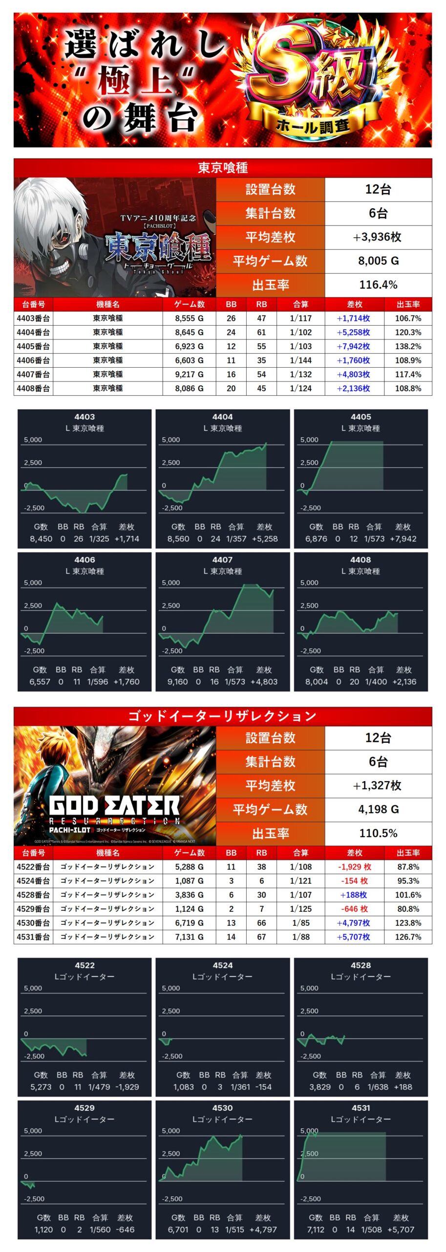 メイン機でも紹介した「東京喰種」更には「ゴットイーター」の2機種をpick upする。2機種12台の平均差枚は+2,631枚で平均出率が114.4%だった。