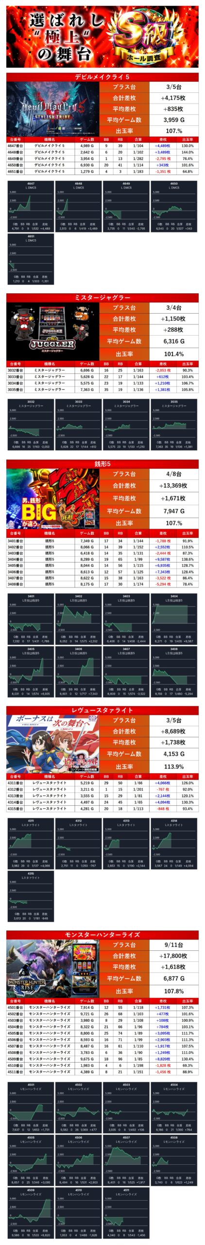 「デビルメイクライ5」「ミスタージャグラー」「銭形5」「レヴュースタァライト」「モンハンライズ」の5機種をpick upする。5機種33台の平均差枚は+1,369枚で平均出率が107.3%だった。