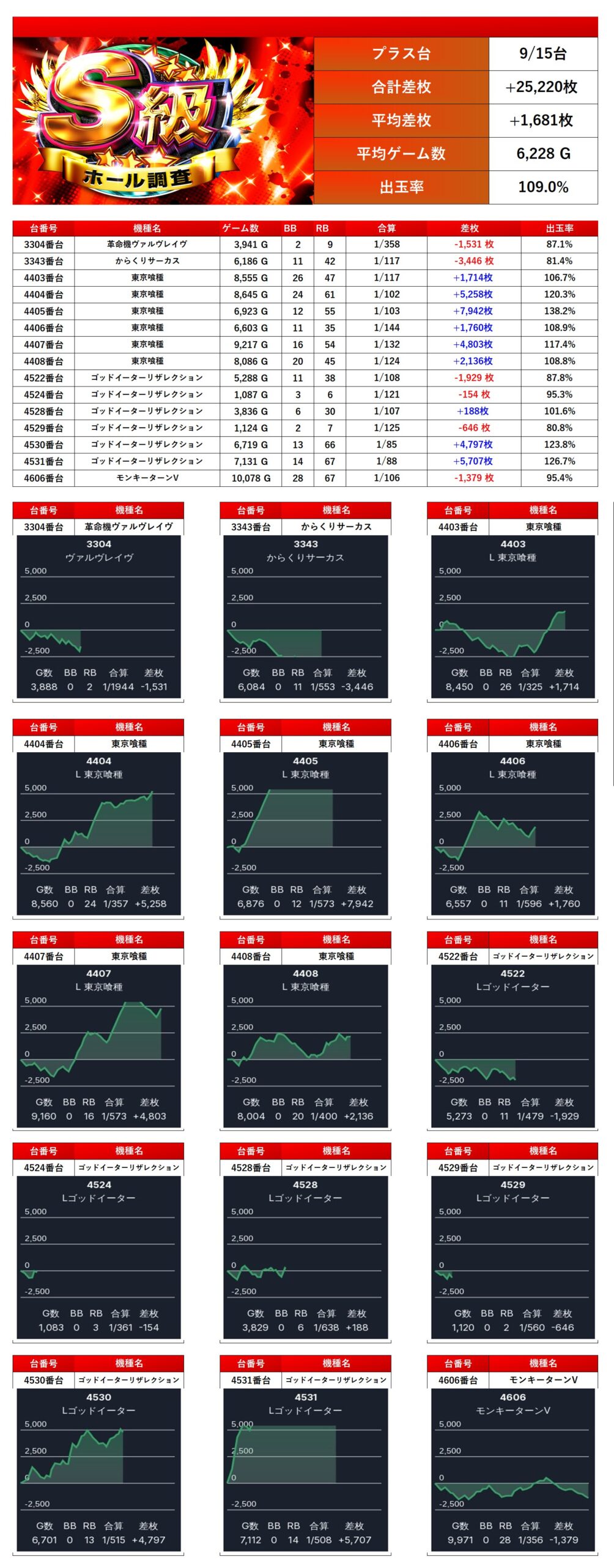 「東京喰種」「からくり」「ヴヴヴ」「モンキー」「ゴッドイーター」の5機種から優秀台を15台pick upする。15台の平均差枚は+1,681枚で平均出率が109.0%だった。