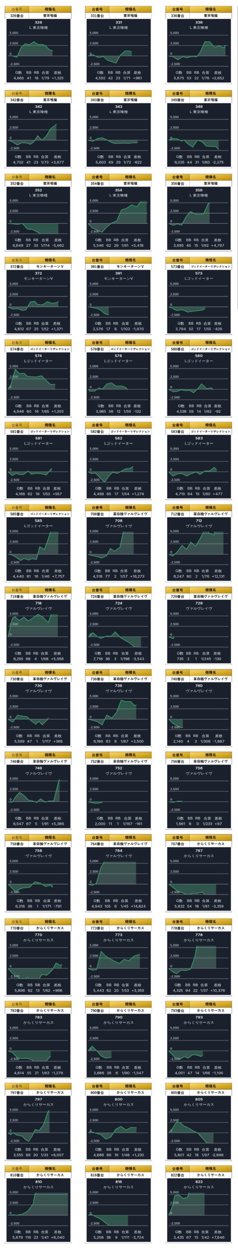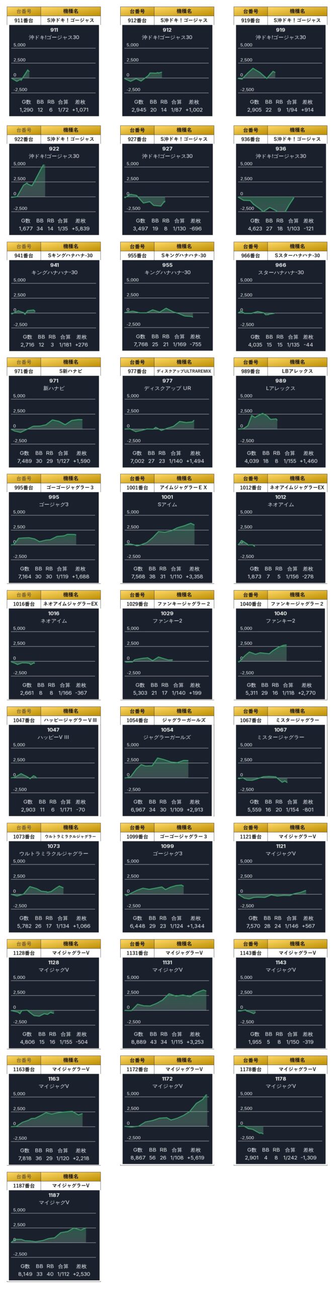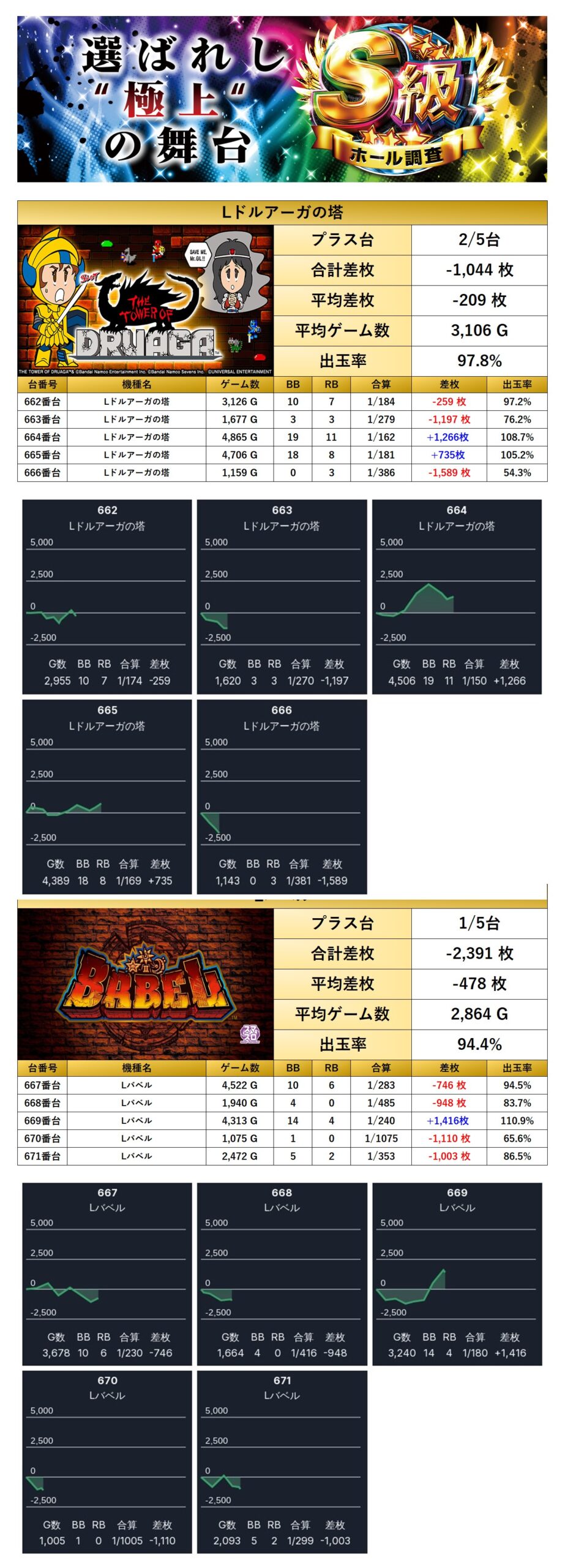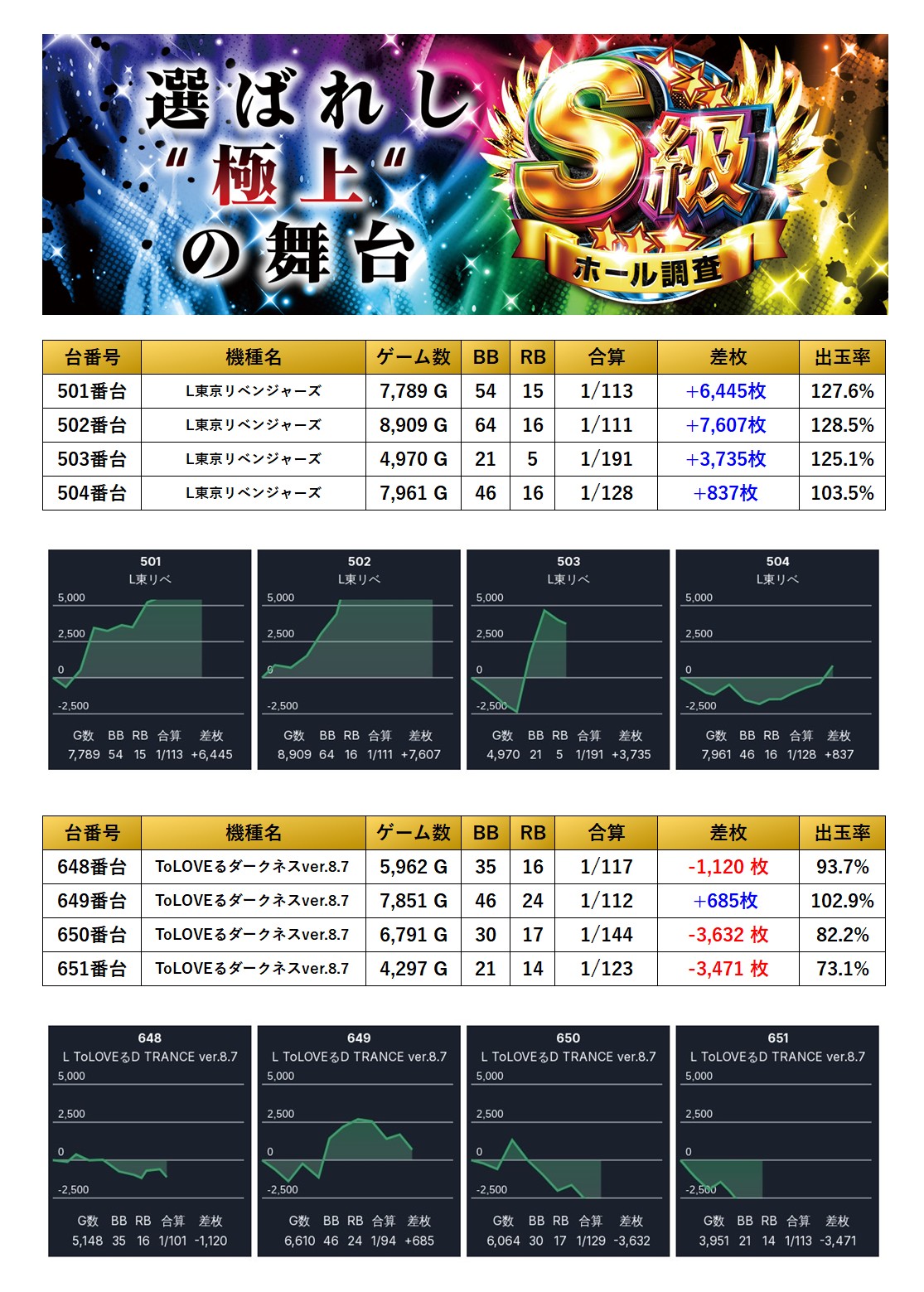 平均差枚+2,084枚、平均出率109.8%となった。「ヴヴヴ」からは3台「からくりサーカス」から1台万枚OVERが出ている。平均ゲーム数が約7,000Gとしっかり打ち込まれていて素晴らしい成績を叩き出した。