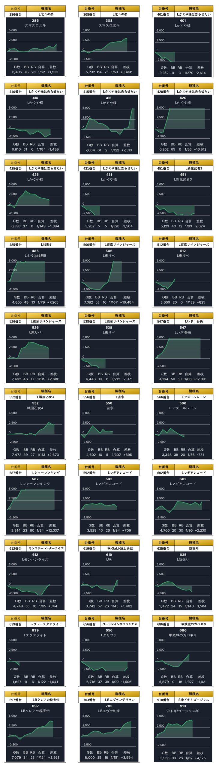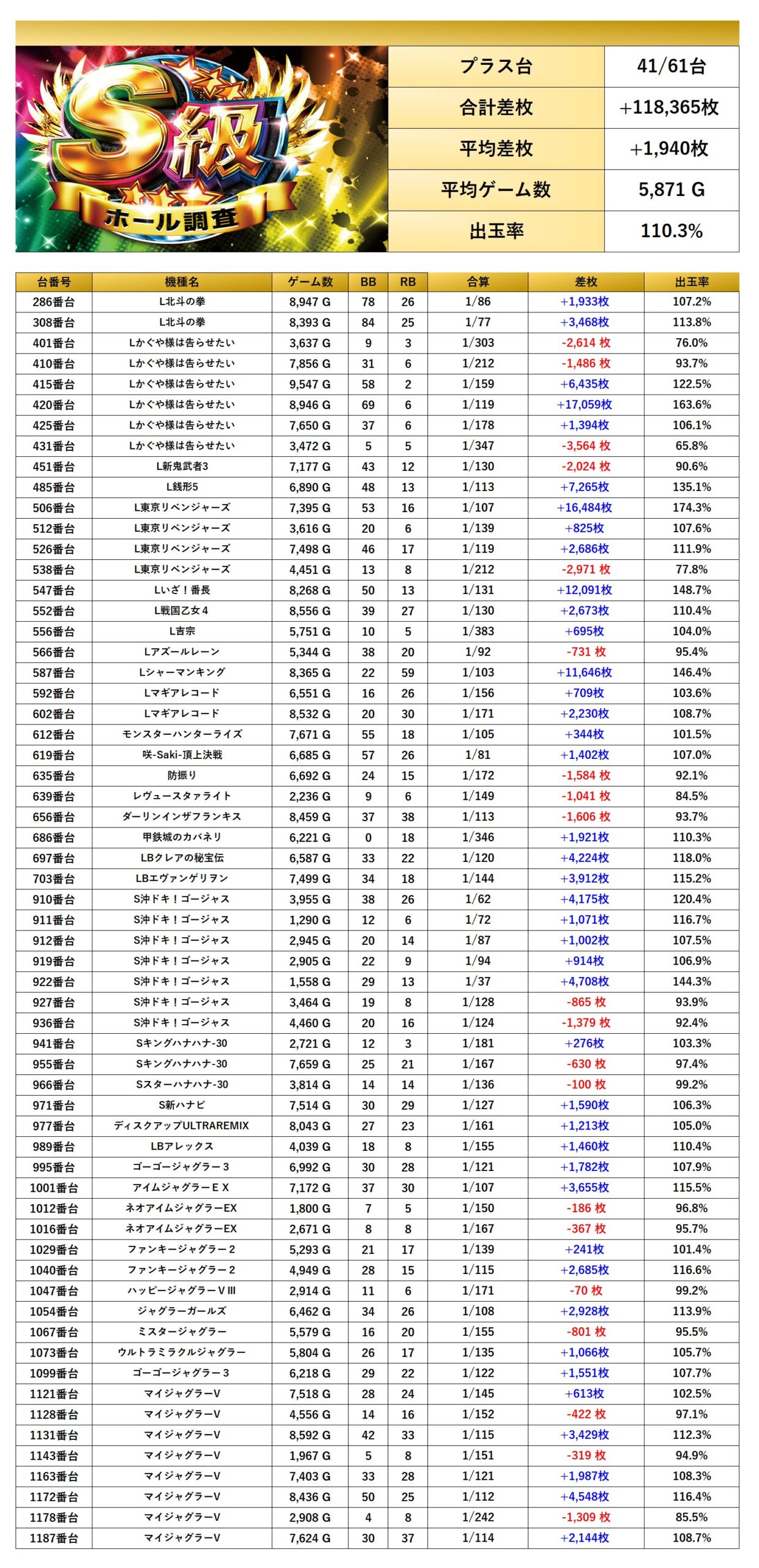 平均差枚+1,940枚、平均出率110.3%となった。万枚OVERが何台も確認でき、対象の量の多さと勝率に驚きだ。
