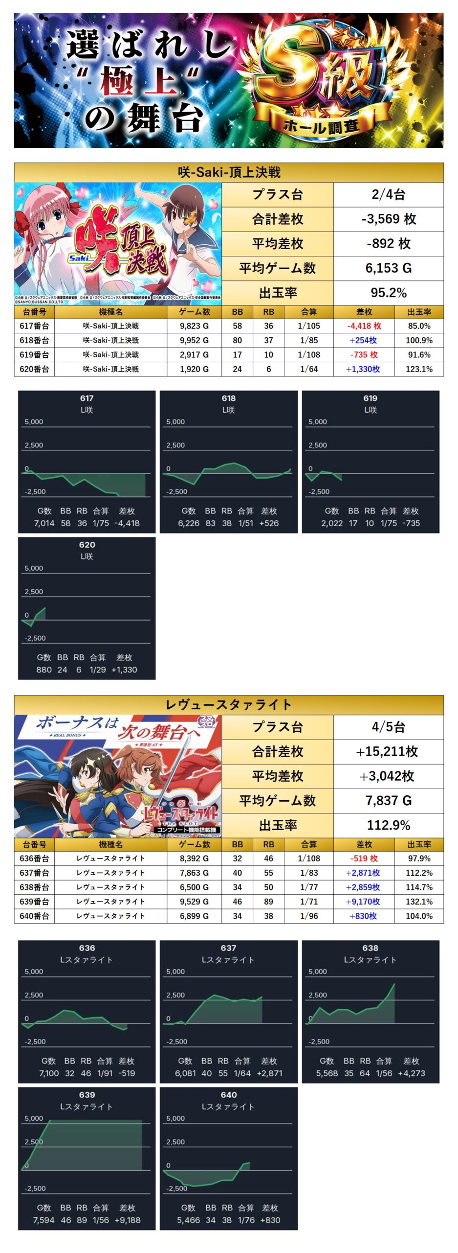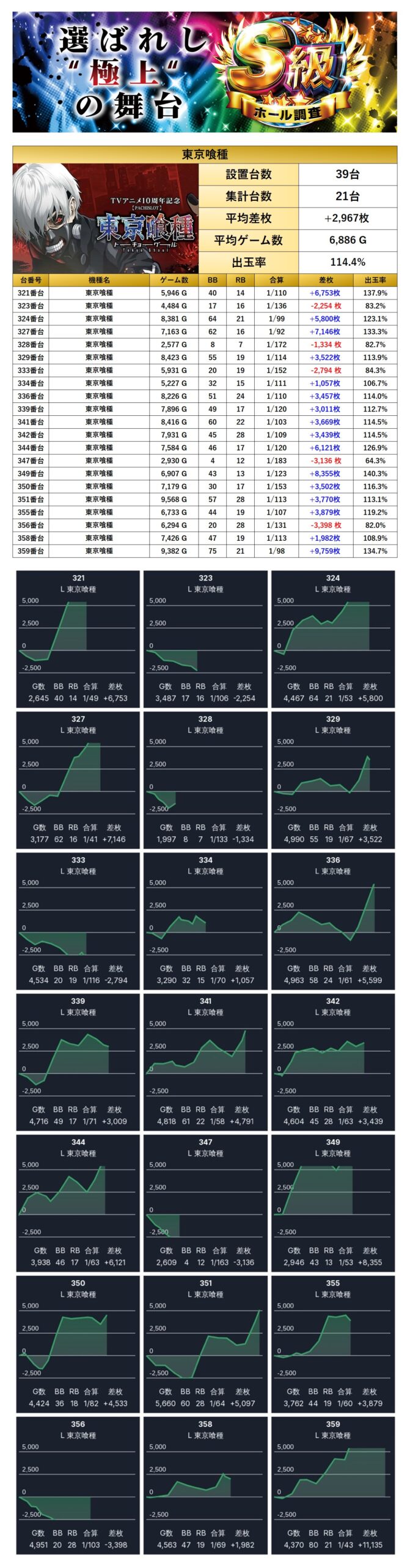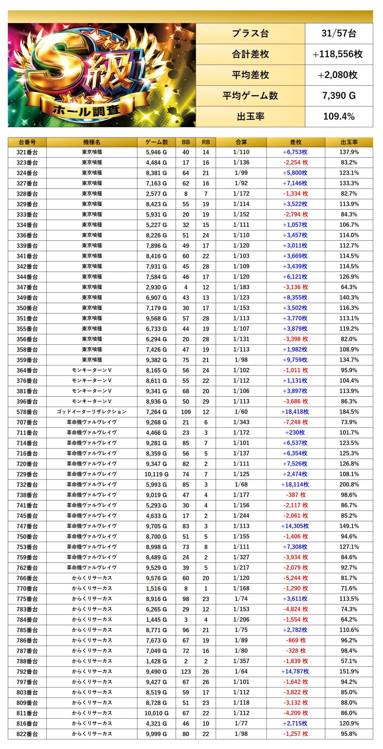 平均差枚+2,080枚、平均出率109.4%となった。「ゴットイーター」から1台「ヴヴヴ」から2台「からくりサーカス」から1台万枚OVERが出ている。平均ゲーム数が約7,000Gとしっかり打ち込まれていて素晴らしい成績を叩き出した。