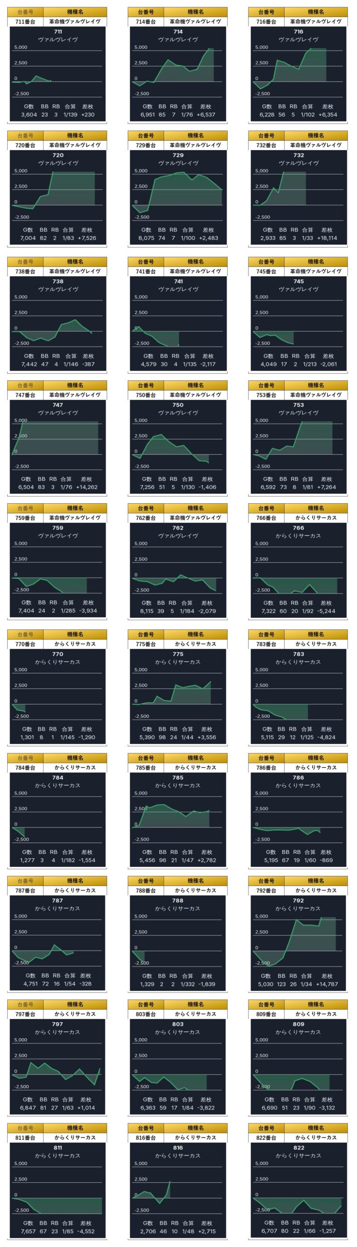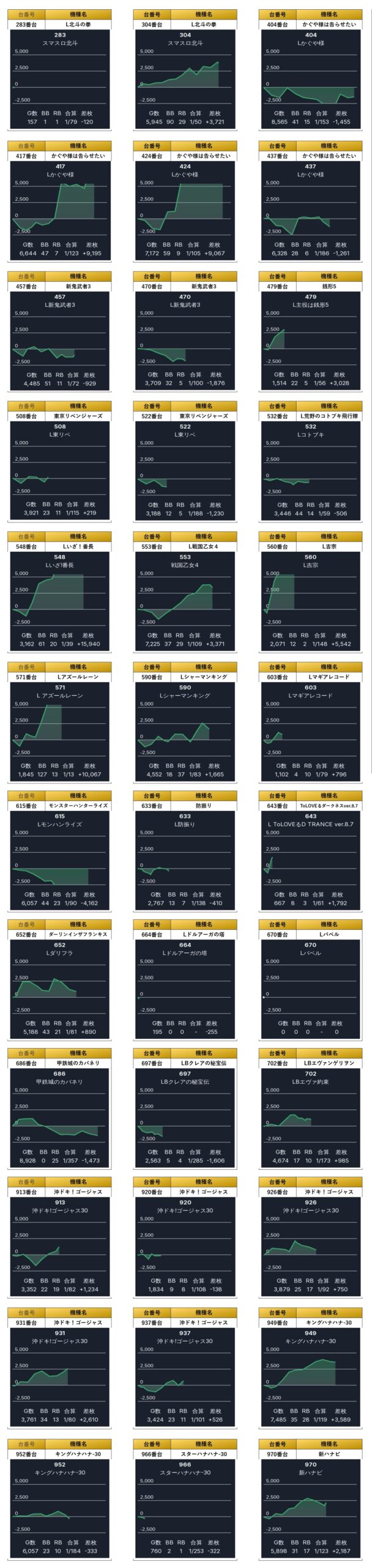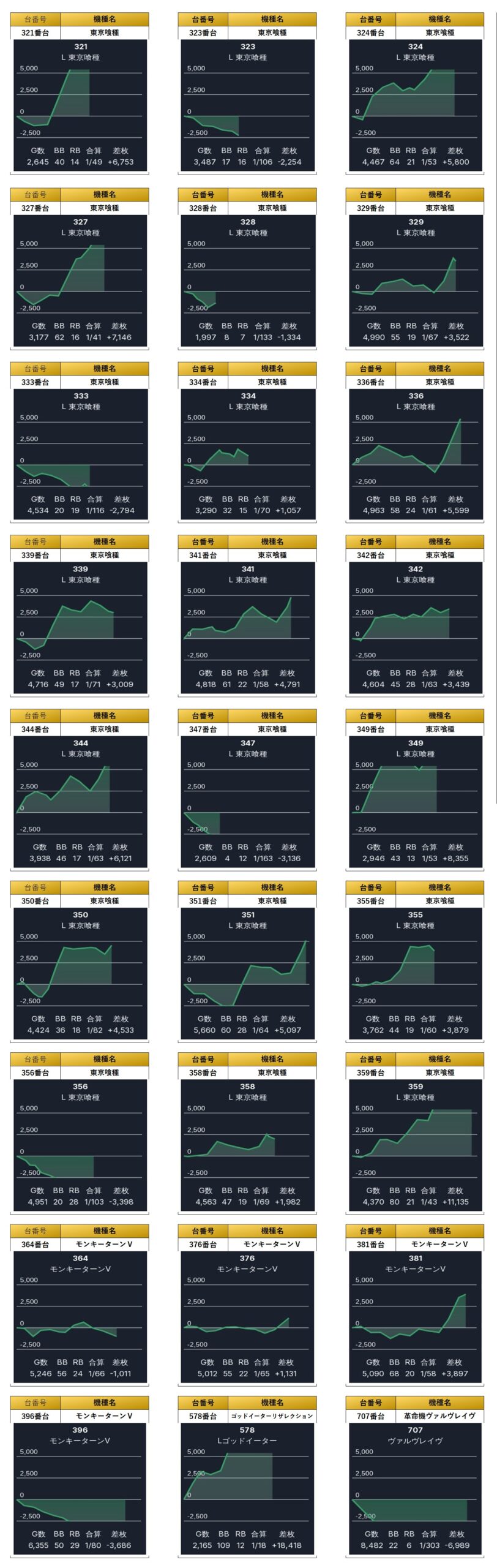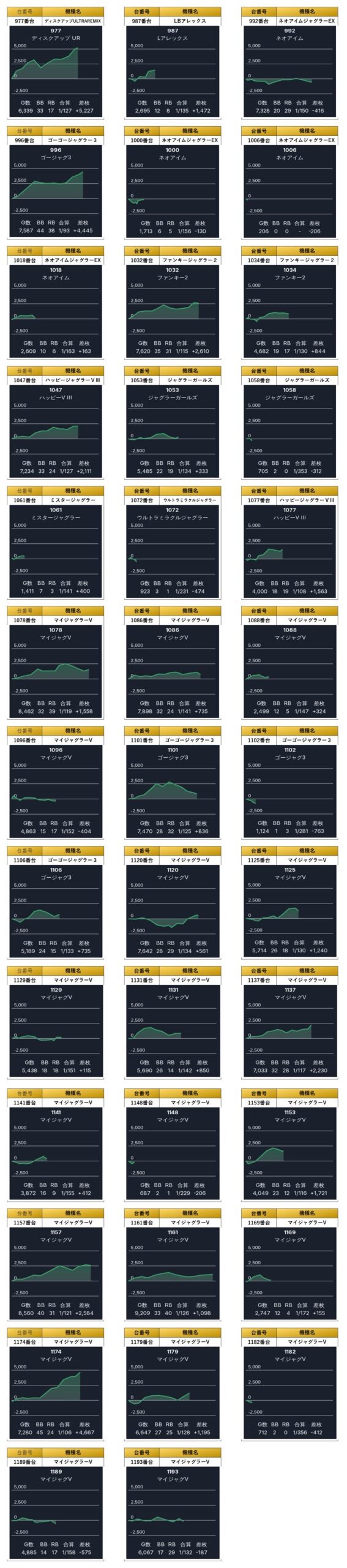 平均差枚+2,080枚、平均出率109.4%となった。「ゴットイーター」から1台「ヴヴヴ」から2台「からくりサーカス」から1台万枚OVERが出ている。平均ゲーム数が約7,000Gとしっかり打ち込まれていて素晴らしい成績を叩き出した。