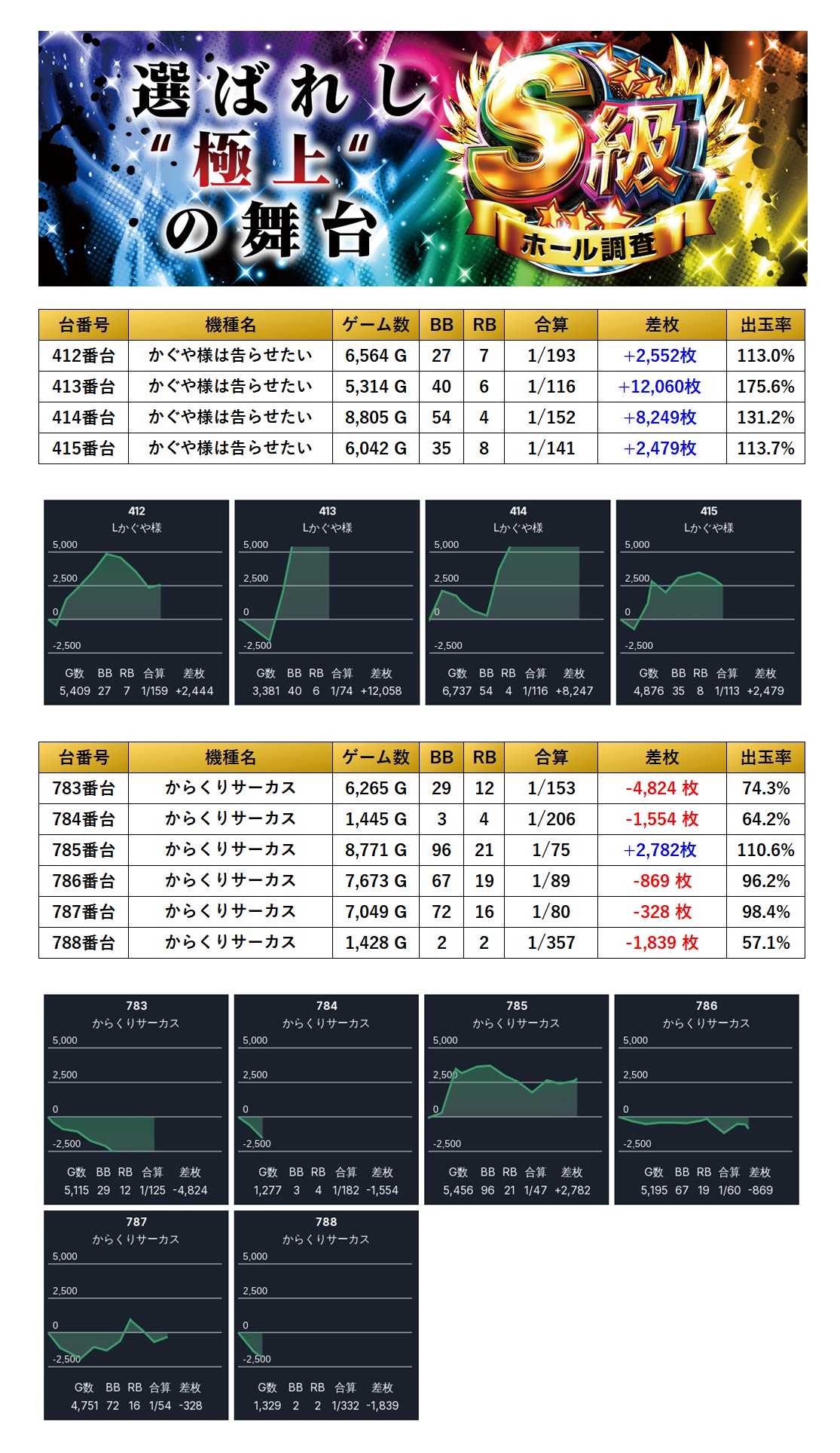 10回目となったS級‐虹‐では仕掛け量に着目してみよう。pick up率が17.3%となった。「メイン機種」からは4台も万枚OVER確認され圧巻の出玉量だった。「ニブイチ仕掛け」では東京喰種がpick upされメリハリがありながら、しっかり打ち込まれ出玉も付いてきている。「並び仕掛け」では2機種pick upされ出玉面でも並びらしい盛り上がりがあった。「4台設置機種」では74台もpick upされている。いずれもしっかりと出玉を確保し、毎度の事ながら832台設置で総差枚+130,929枚、平均+157枚とメリハリはあるが、質の高さには驚かされる。今回も文句なしの三つ星評価と言えるだろう。次回の開催も期待感がしっかり持てる。