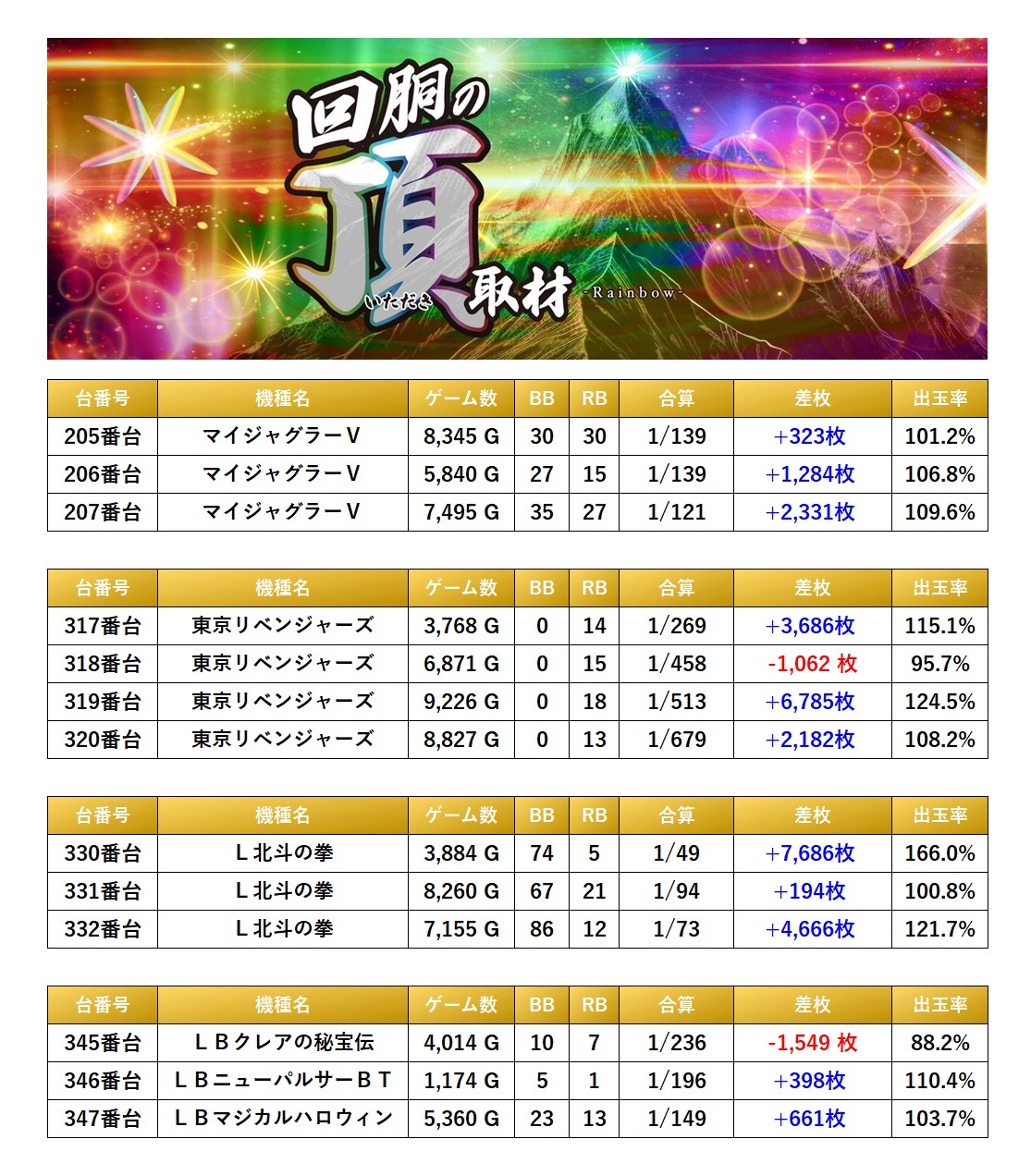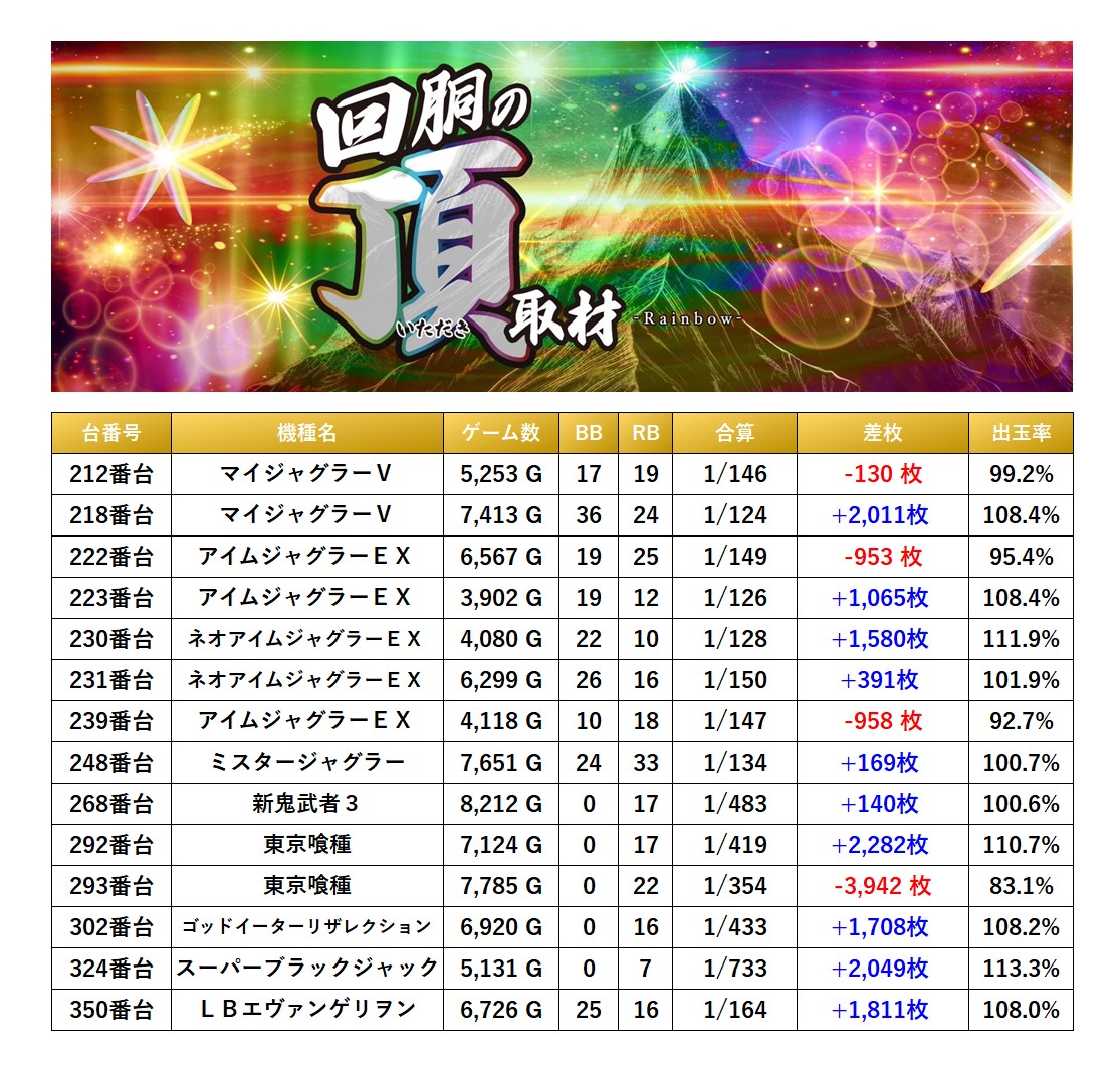 各所から14台の優秀台を発見した。平均差枚は+516枚で平均出率が102.6%だった。