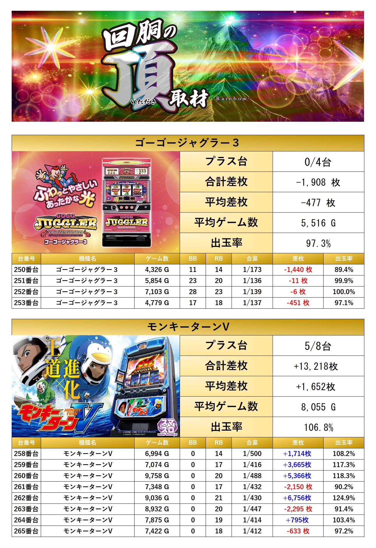 「ゴージャグ」「モンキーターン」の2機種をpick upする。2機種12台の平均差枚は+943枚で平均出率が104.3%だった。