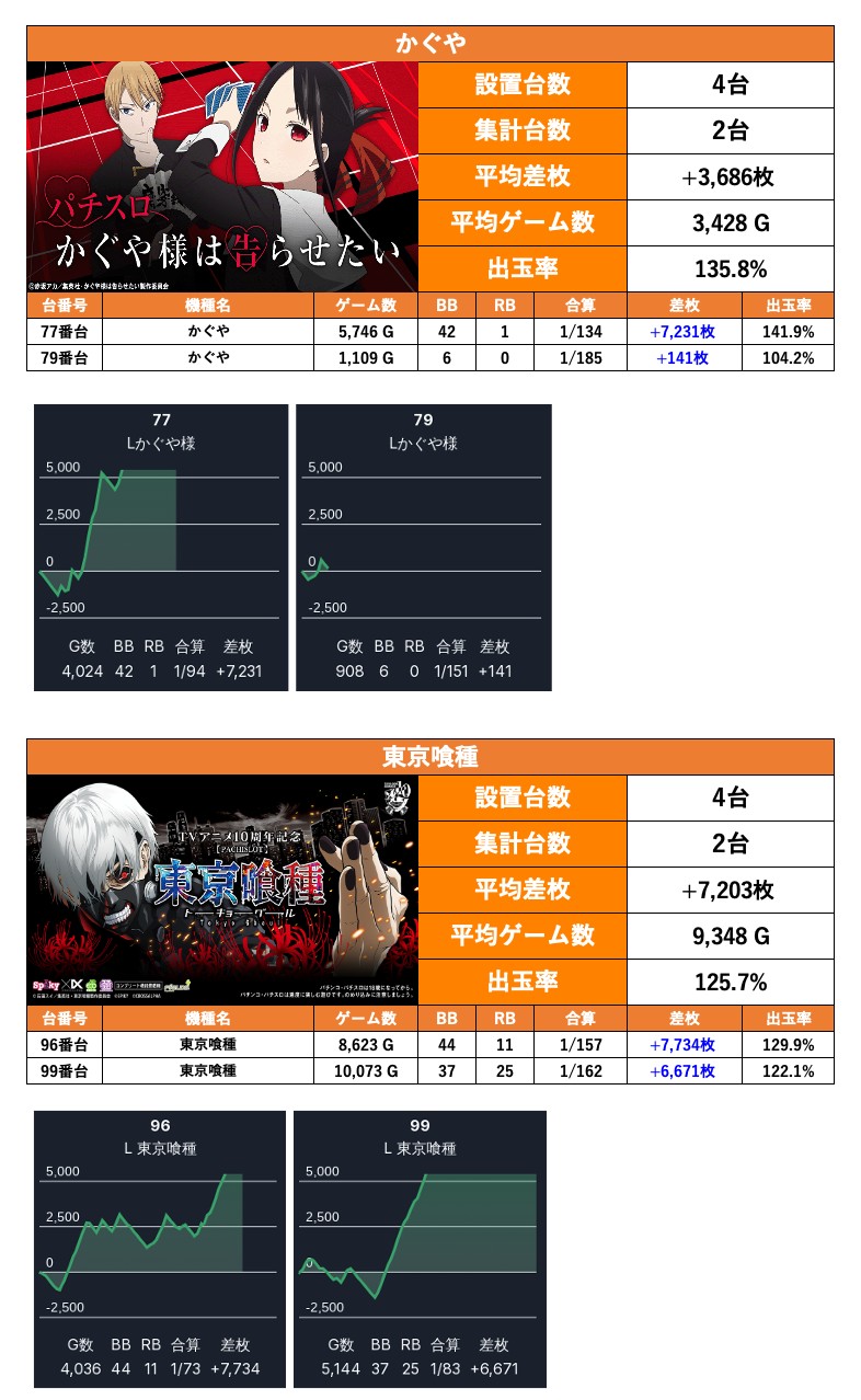 2機種4台の平均差枚は+5,444枚で平均出率が128.4%だった。