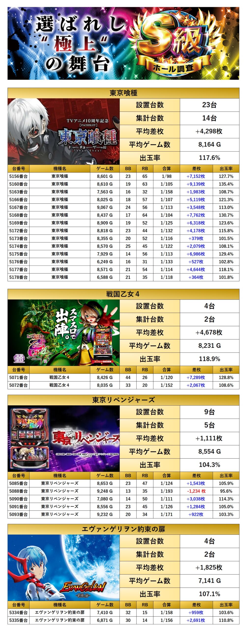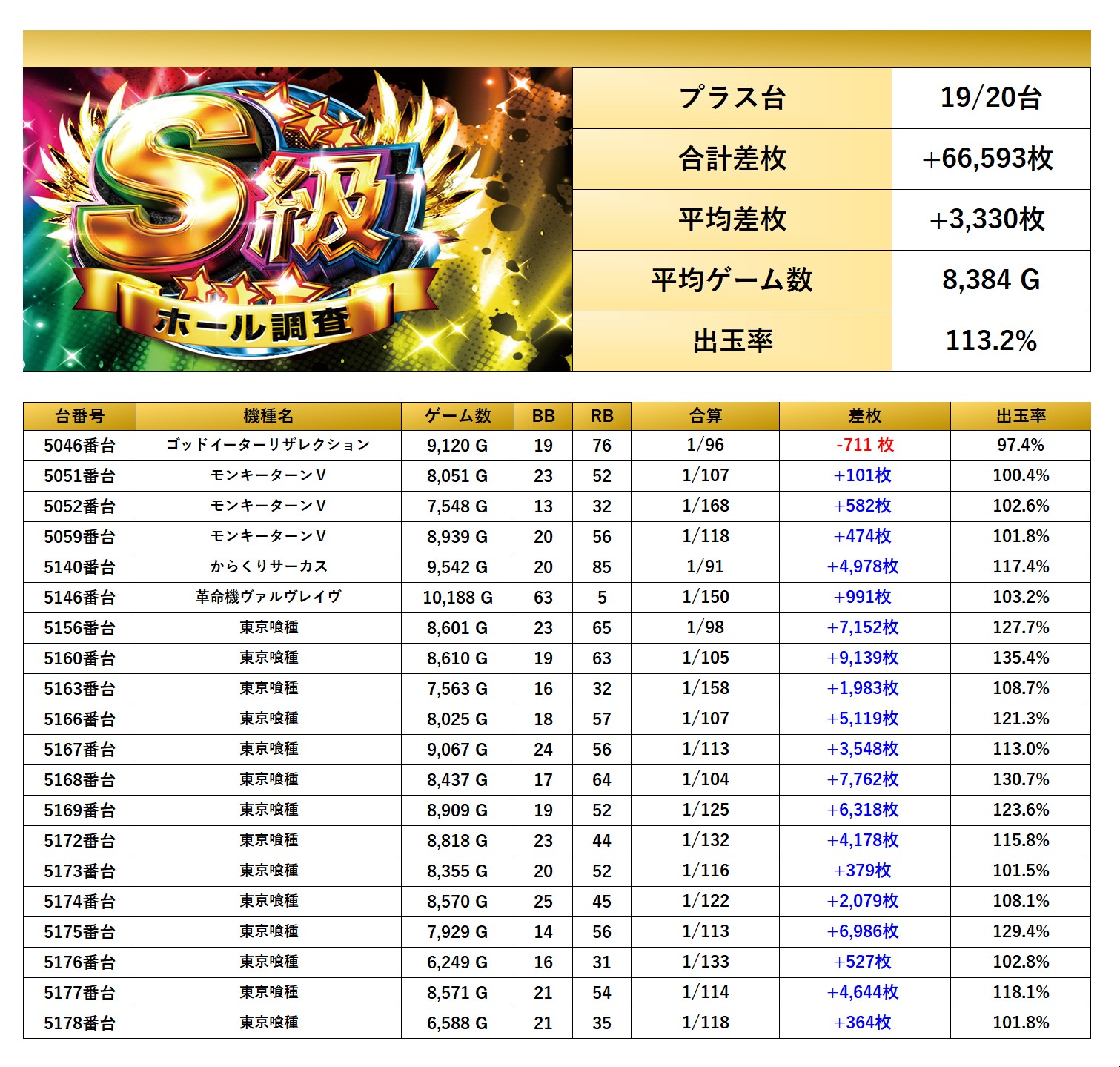 「東京喰種」「からくり」「モンキー」「ゴッドイーター」「ヴヴヴ」の5機種から20台の優秀台をpick upする。20台の平均差枚は+3,330枚で平均出率が113.2%だった。