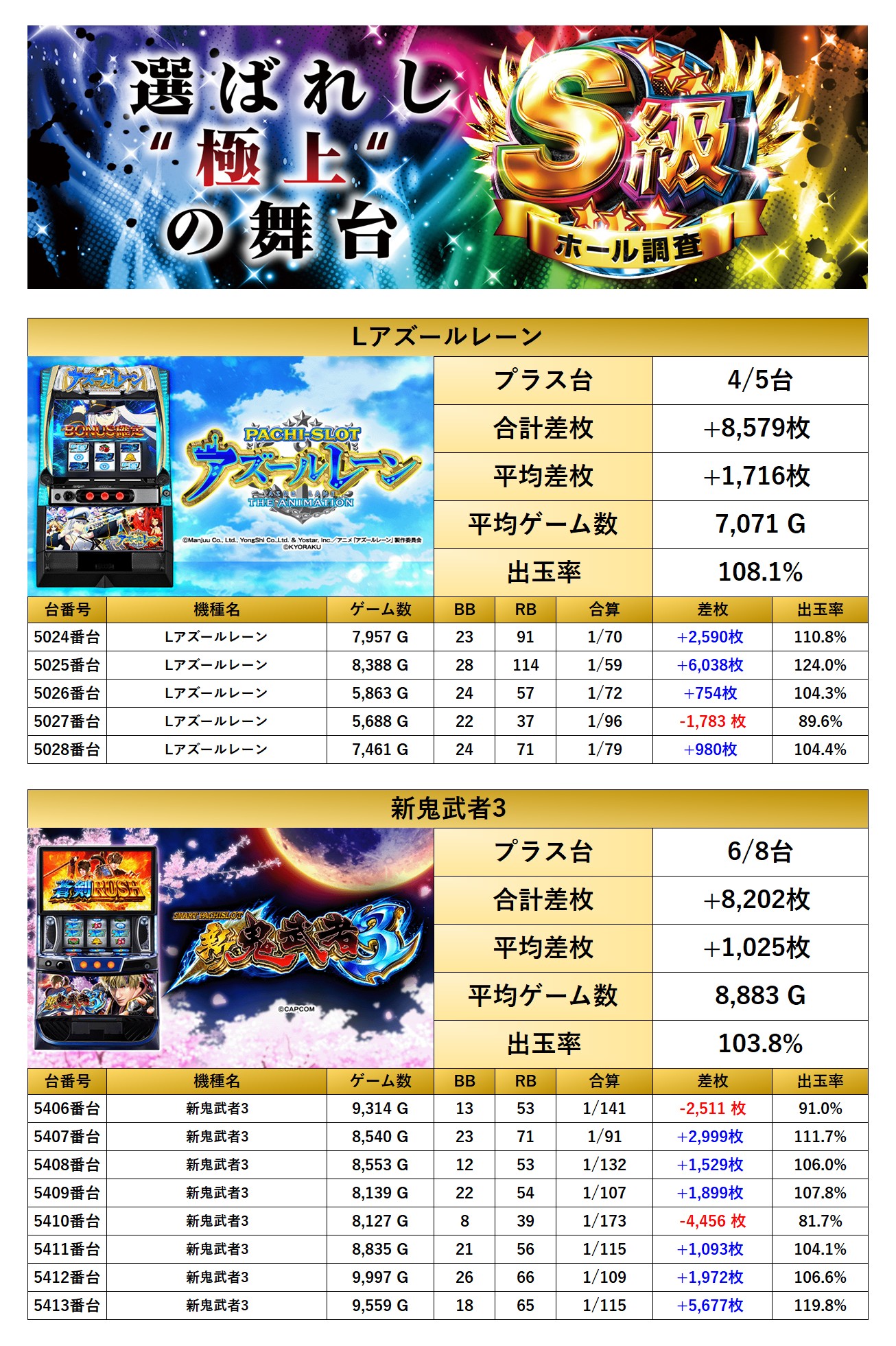 「アズールレーン」「新鬼武者3」の2機種をpick upする。2機種13台の平均差枚は+1,291枚で平均出率が105.3%だった。