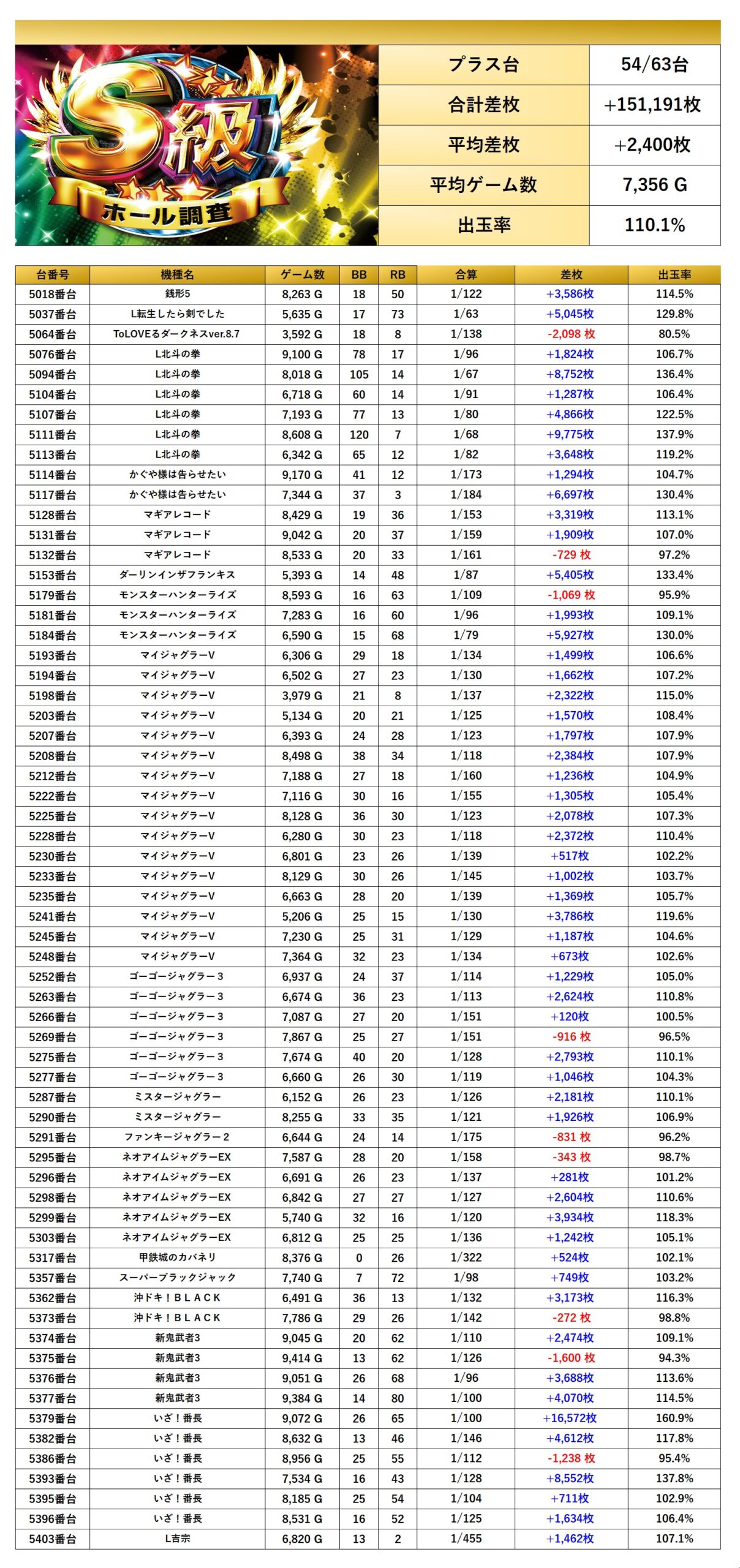 4台以上設置機種から優秀台を探すと63台をpick upすることができた。63台の平均差枚は+2,400枚で平均出率が110.1%だった。