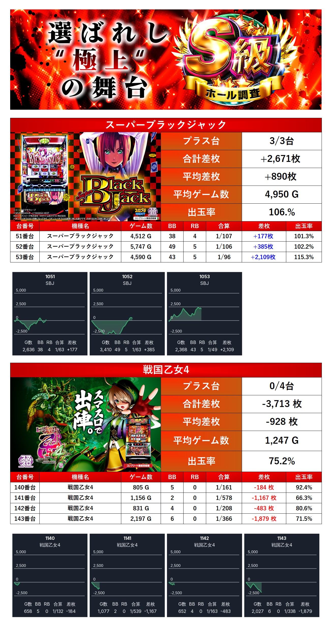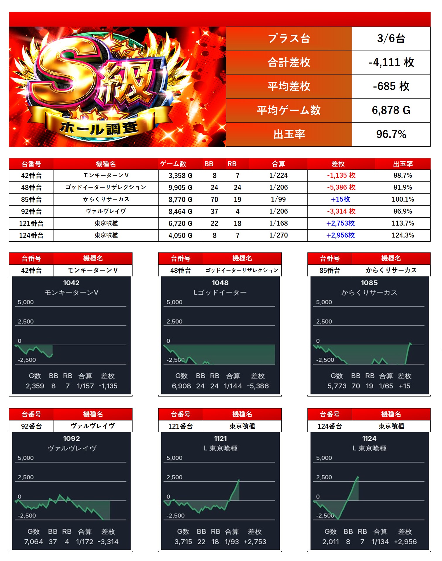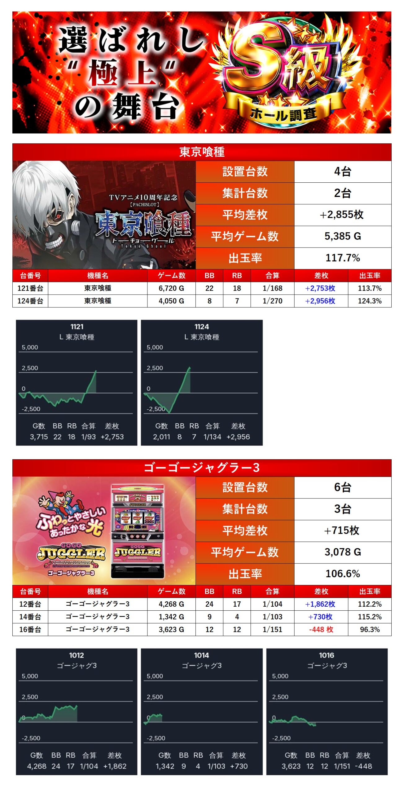28回目となったS級‐赤‐は仕掛け量は十分にもかかわらず、回転数が少ない台が多く展開に恵まれない結果となり、今回は一つ星評価となってしまった。出玉面では全体的に控えめな結果となってしまったが、「ニブイチ仕掛け」東京喰種やジャグラーしっかりとプラス域を確保できていた。「2台設置以下」も多彩な仕掛けとなっていたが回転数が少ない台が多く見られ伸びしろがあり、今回のpick up率は15.7%と広範囲に多数の仕掛けがされていた事が伺える。次回は期待している。