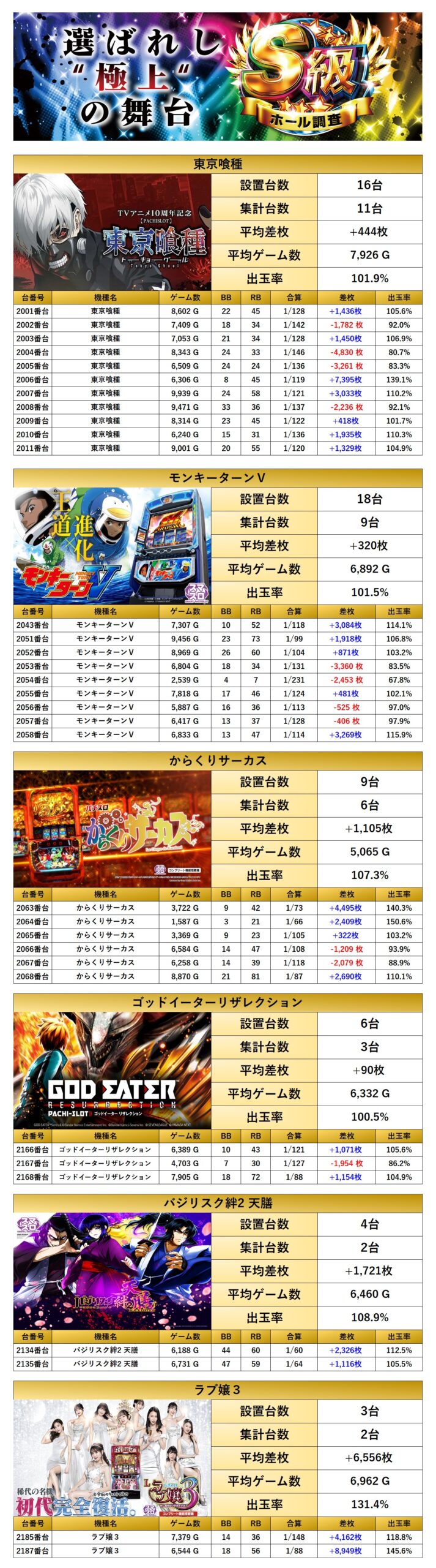 「東京喰種」「モンキーターン」「からくりサーカス」「ゴットイーター」「バジリスク絆2天膳」「ラブ嬢3」の6機種33台をpick up。平均差枚+946枚、平均出率104.6%と多彩な機種が対象となった。
