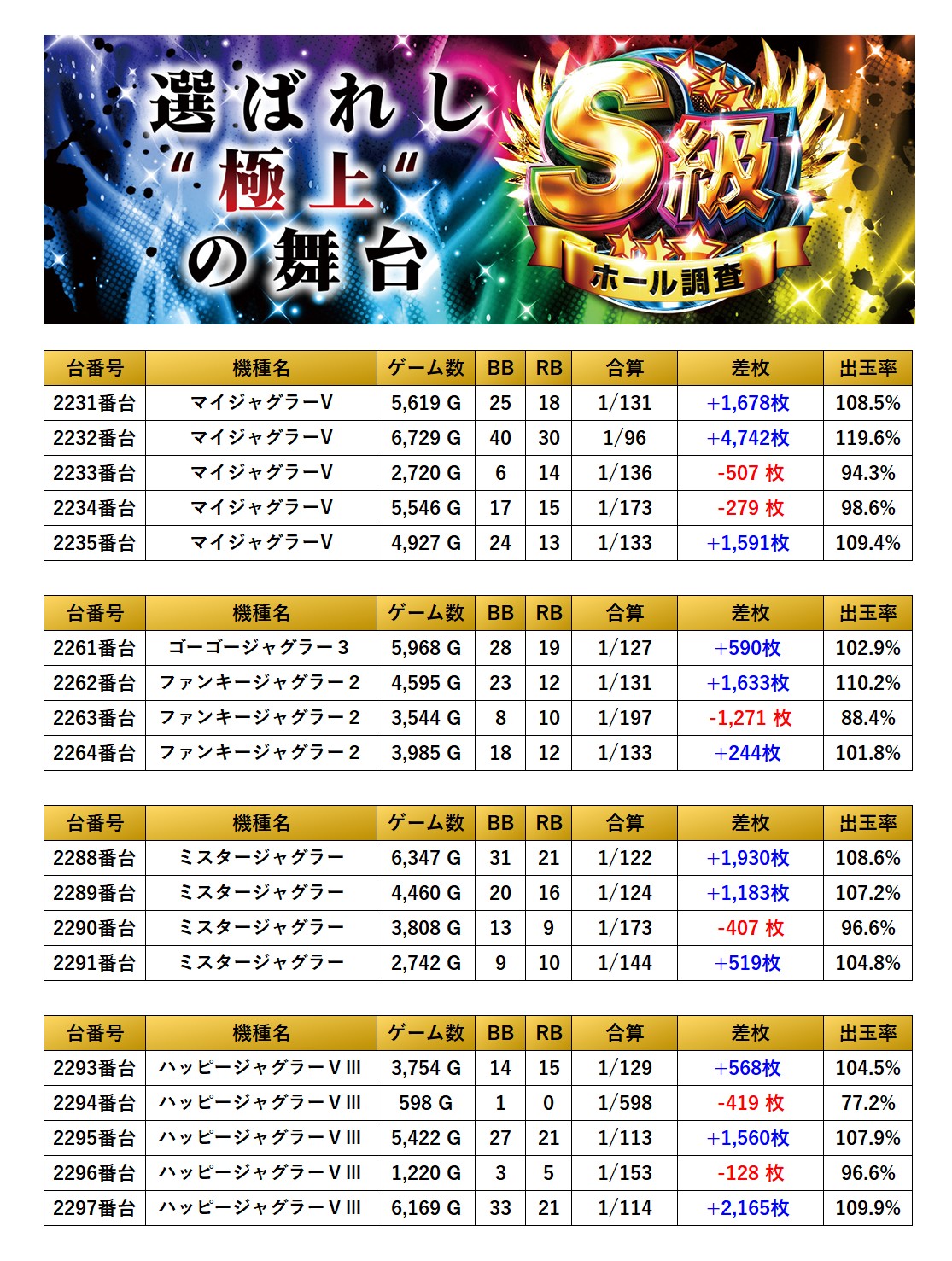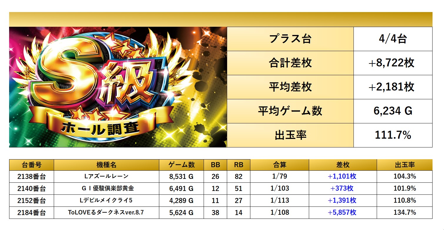 初開催となったS級虹では「メイン5機種」のpick up、「全台が好調な機種」は3機種pick up、「設置の半分が好調な機種」は6機種pick up、「4台以上の並び」が4箇所のpick up、「4台以上機種」からは29台のpick up、「法則に捉われない台」からは4台pick upされ全台プラス域となった。多彩な機種がpick upされ仕掛け量は十分だったものの突出した出玉は見れず、全館総差枚平均が−479枚と展開に恵まれず今回は二つ星評価となったが、仕掛け全体を見ると設置台数の34.3%がpick upと驚異的な数値を叩き出し、叩ける環境は準備されていた。今後も調査も期待している。