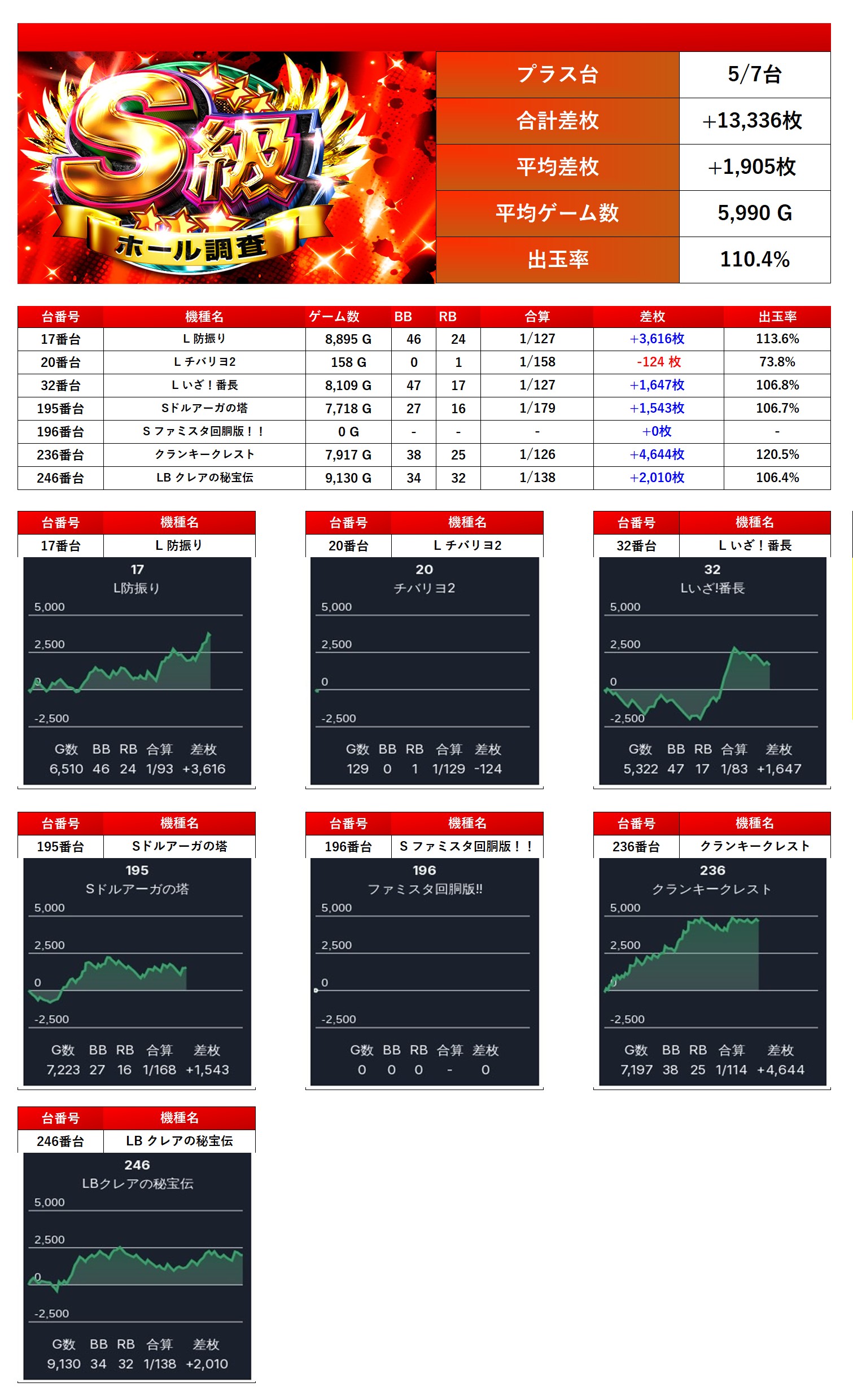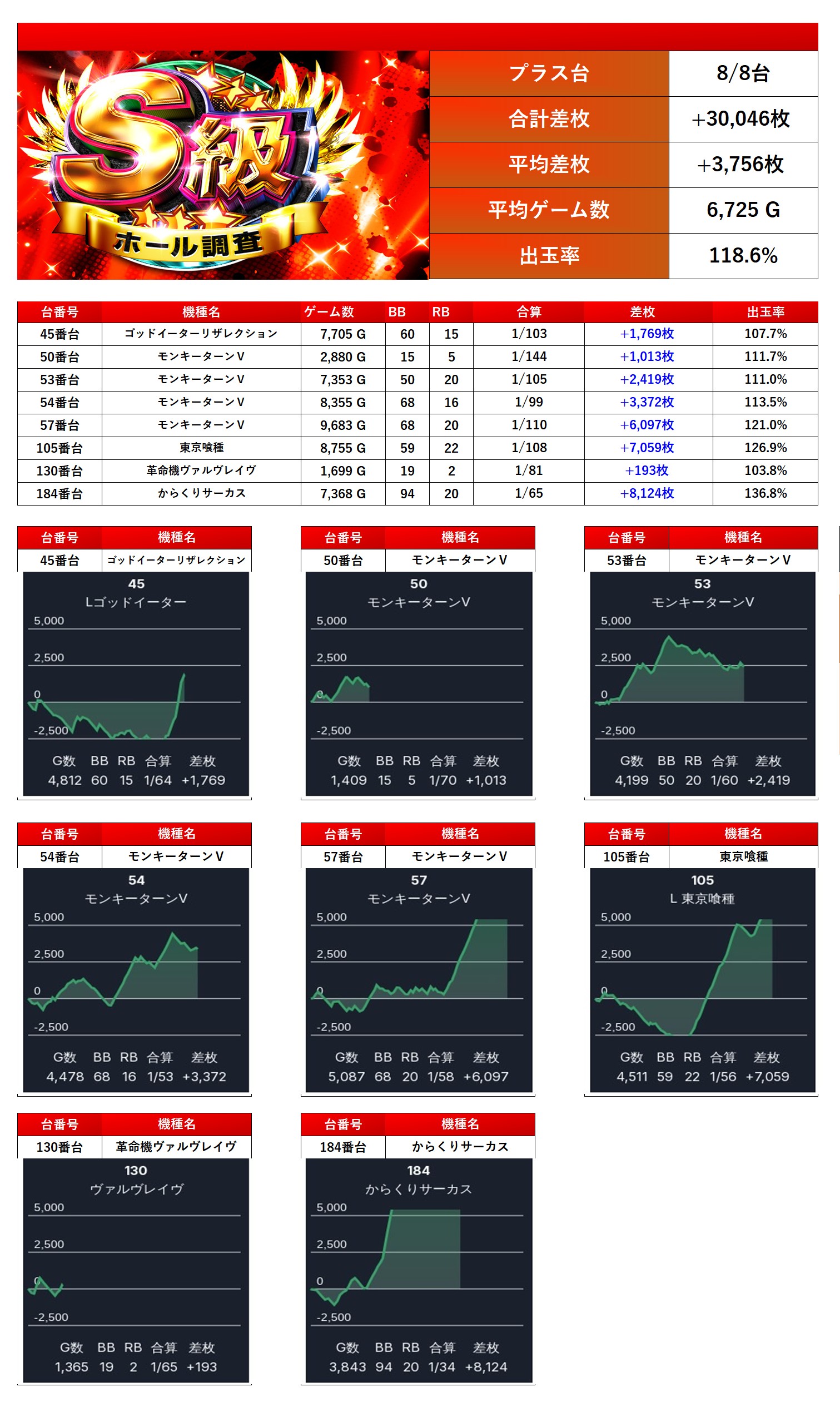 平均差枚+3,756枚、平均出率118.6%となった。8/8全台がプラス域と素晴らしい結果となった。