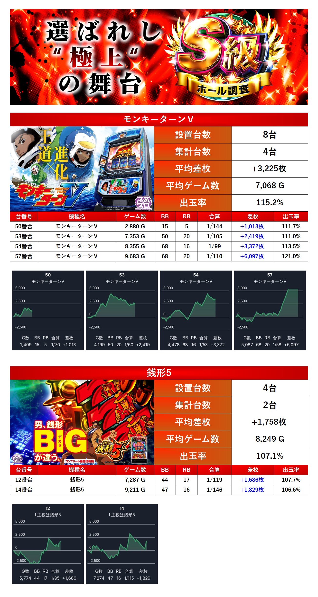 20回目となったS級調査赤は、「メイン優秀台」は安定感ある出玉を確保し、「全台系」では2機種がpick up、「設置の半分が好調だった機種」では2機種pick upされ過半数がしっかり打ち込まれ出玉も好調そうだ。「2台設置機種」では7台がpick upされた。今回の仕掛け率は10.8%となっていた。全体を通してみると総差枚平均が−89枚と惜しくもpickup出率が物足りずでの二ツ星評価となってはしまったが、pick upされた台の質はよく、最高評価を獲得できるポテンシャルは大いにあり。今後の調査にも期待している。