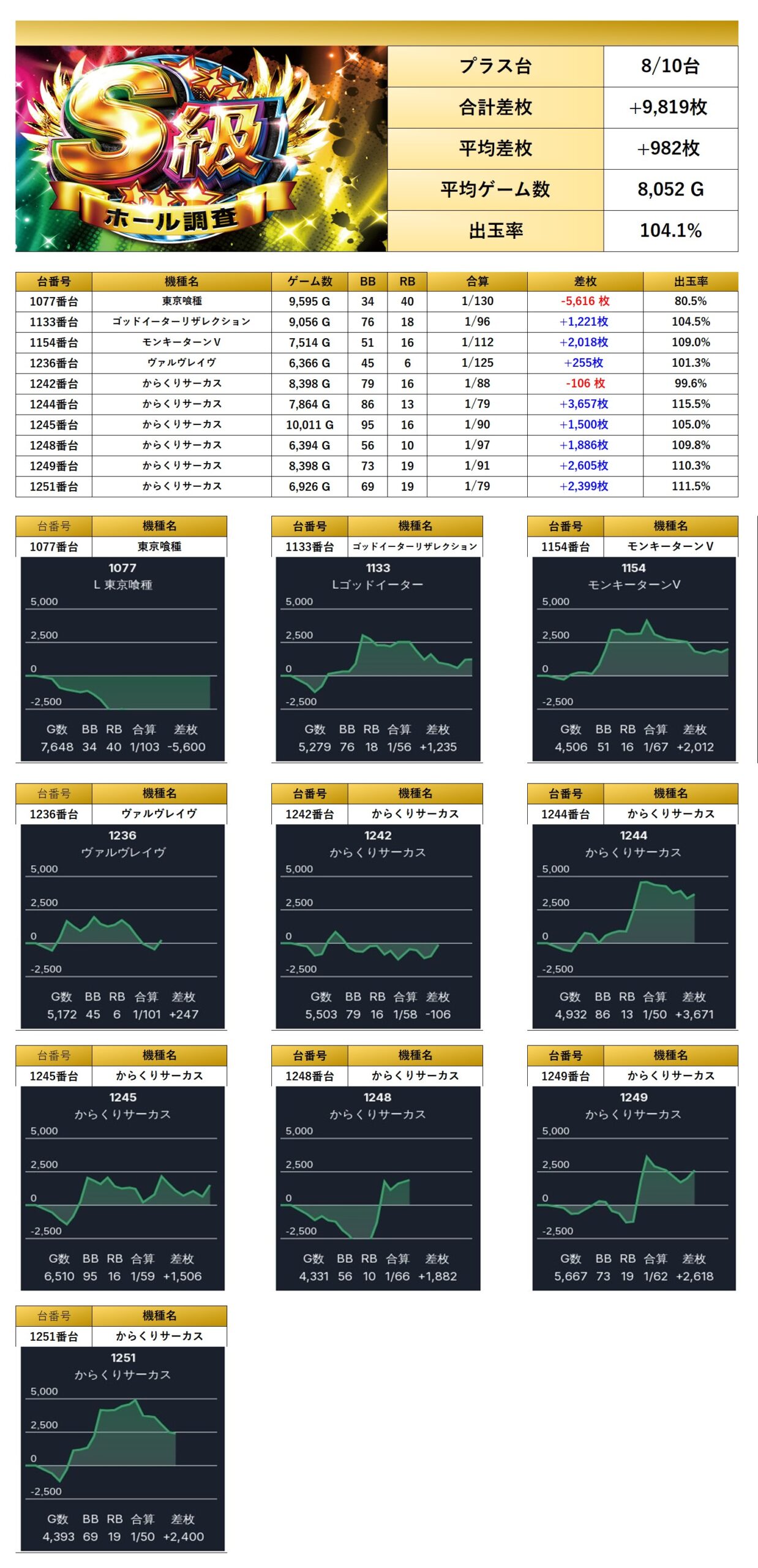 メイン優秀台10台の平均差枚は+982枚、出率104.1%とール全体の盛り上がりを牽引する仕掛けだったといえる。