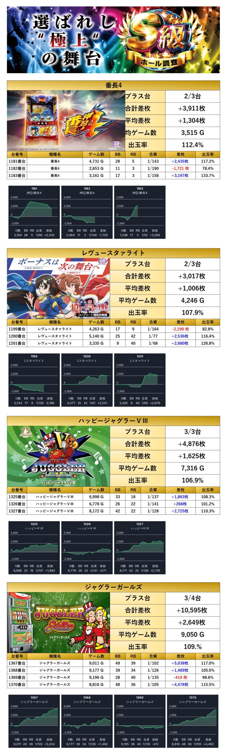 9回目の パラッツォ志津店 S級‐虹‐調査は、メイン機種さらには全台系では4機種pick upされ、安定感のある出率を見せた。さらにはニブイチ・仕掛けでは強烈なインパクトが特に印象的な内容となった。