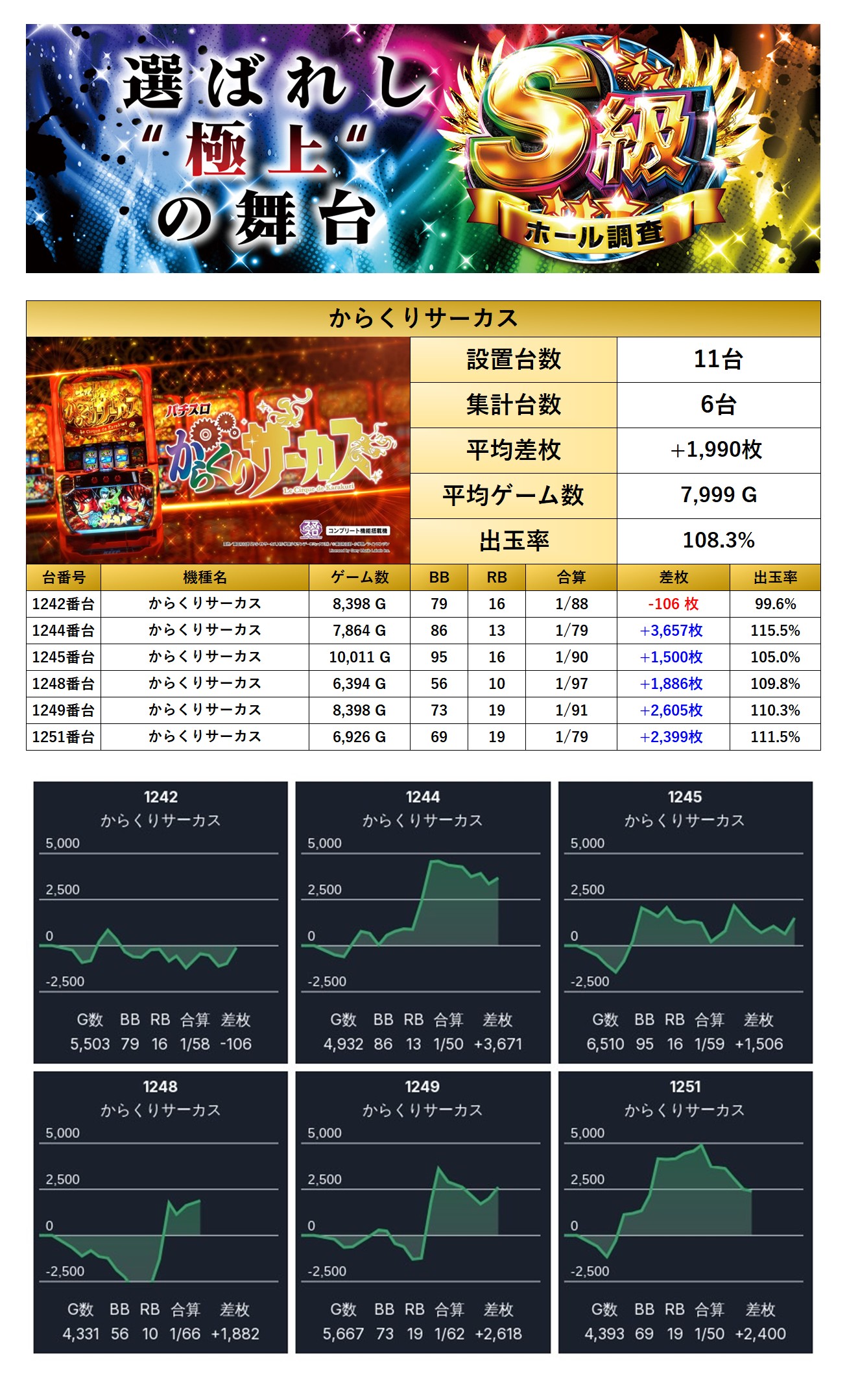 平均差枚+1,723枚、出率108.3%と安定感のある結果に。ファンの期待を裏切らない仕掛けでしっかりと魅せた。
