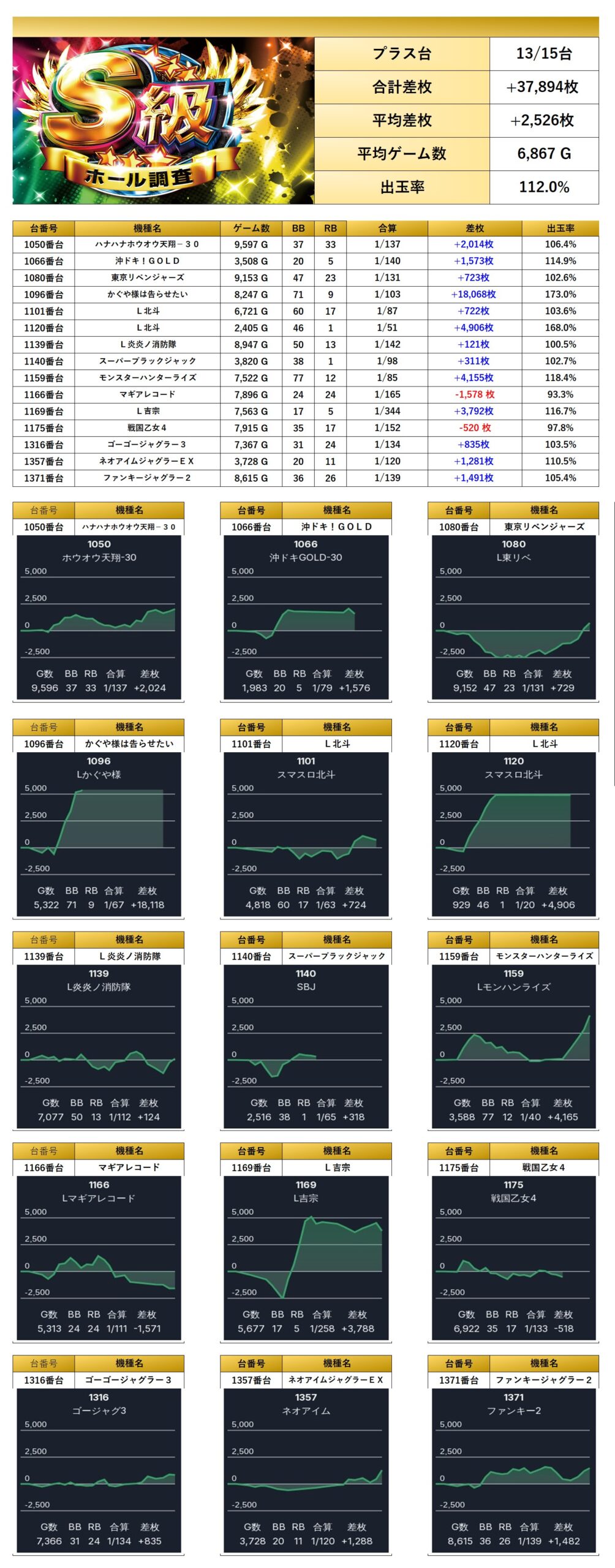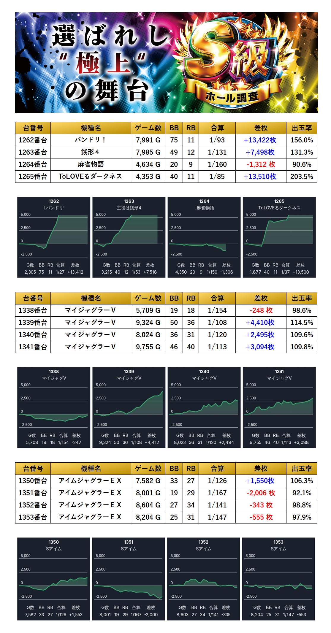 平均差枚+2,526枚、出率112.0%と非常に優秀な数値を記録。全体の盛り上がりをしっかりと支える構成となり、メイン・全台・並びに加えて“勝負できる箇所”をさらに広げる要素となった。