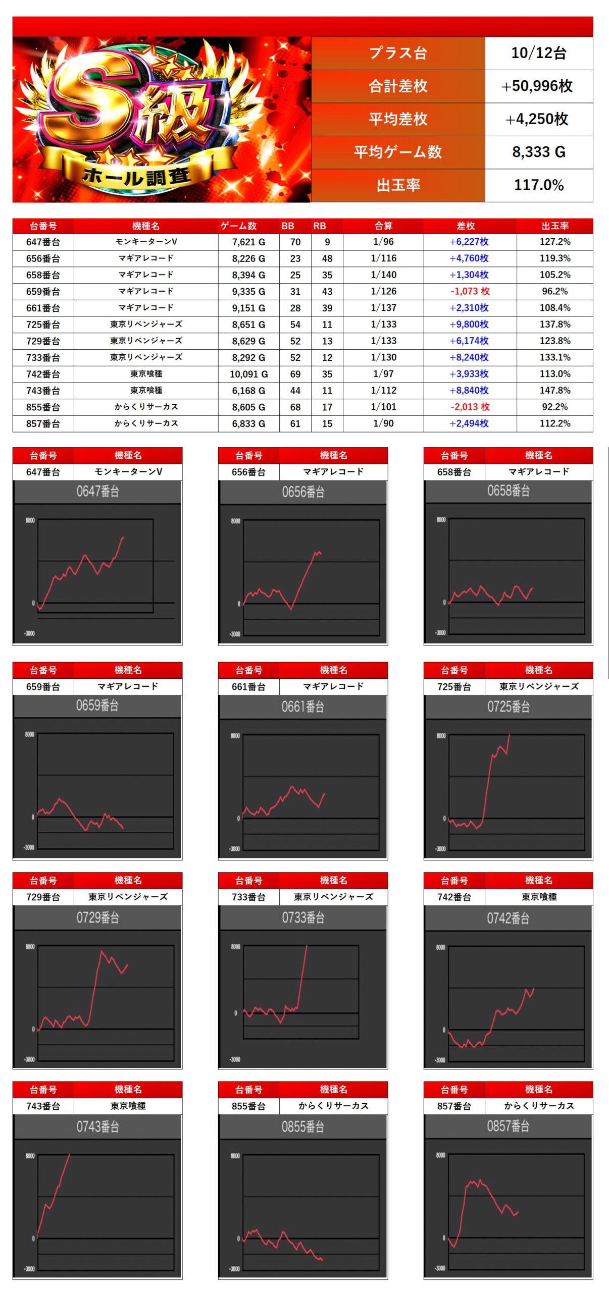 「東京喰種」「モンキー」「からくり」「マギレコ」「東京リベンジャーズ」「モンキーターン」から12台の優秀台をpick upする。12台の平均差枚は+4,250枚で平均出率が117.0%と優秀台な成績だった。