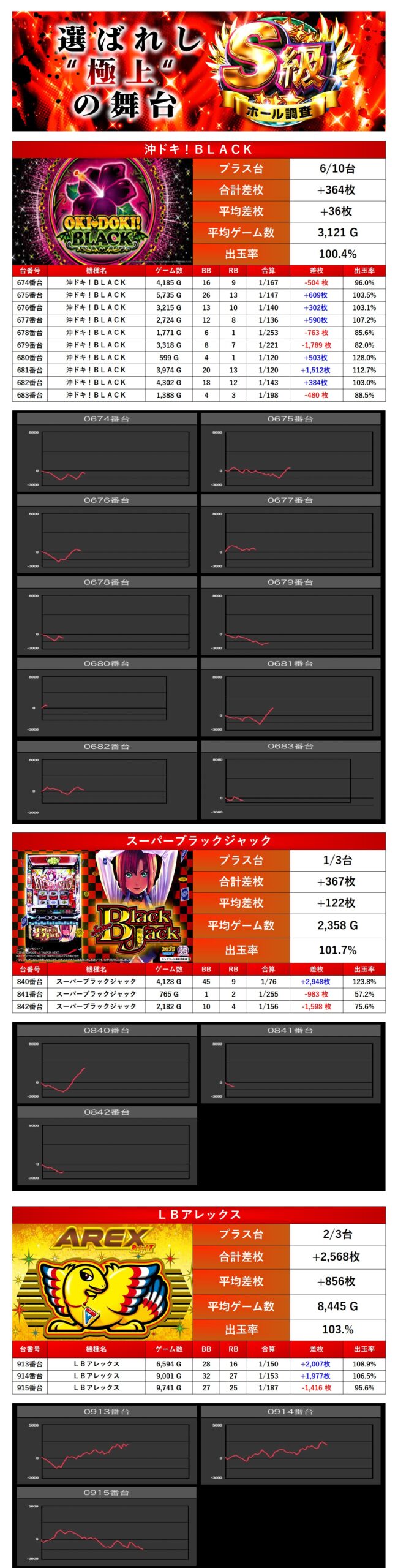 「沖ドキ!BLACK」「スーパーブラックジャック」「LBアレックス」の3機種をpick upする。3機種16台の平均差枚は+206枚で平均出率が101.6%だった。