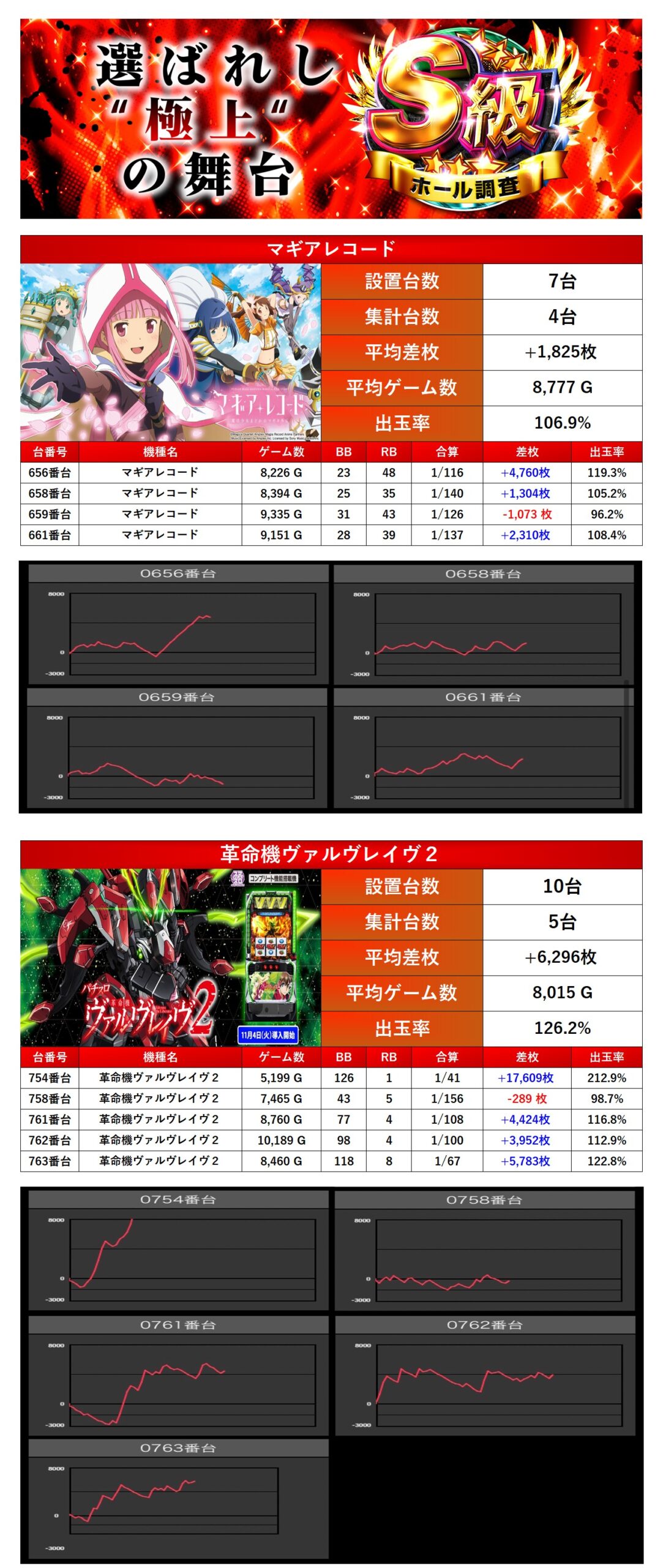 メイン機種でも紹介した「マギレコ」更には「ヴヴヴ2」の2機種をpick upする。2機種9台の平均差枚は+4,309枚で平均出率が117.2%とメリハリはあるが出率も素晴らしくインパクトがあった。