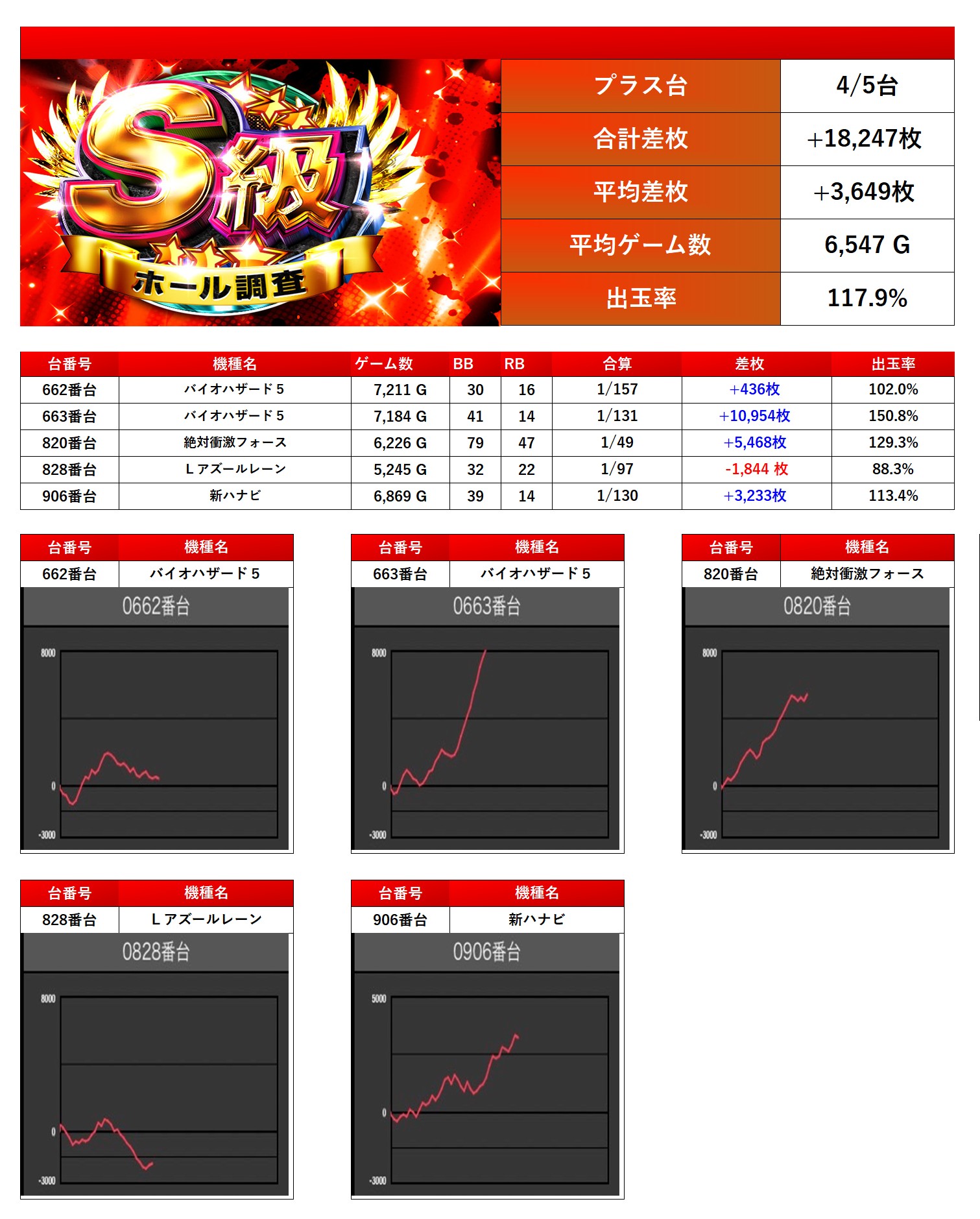 対象から5台をpick upする。5台の平均差枚は+3,649枚で平均出率が117.9%と圧巻の出率だった。