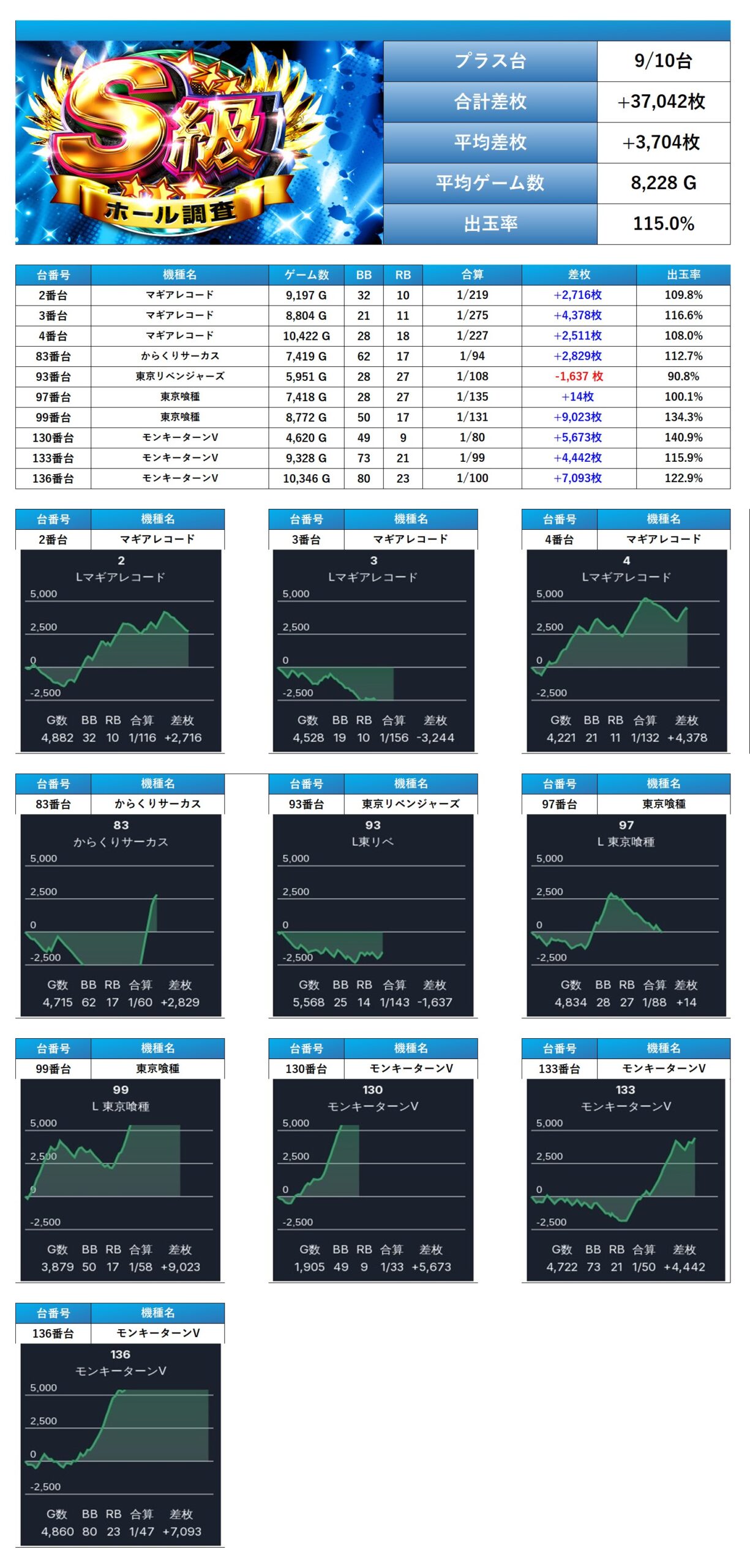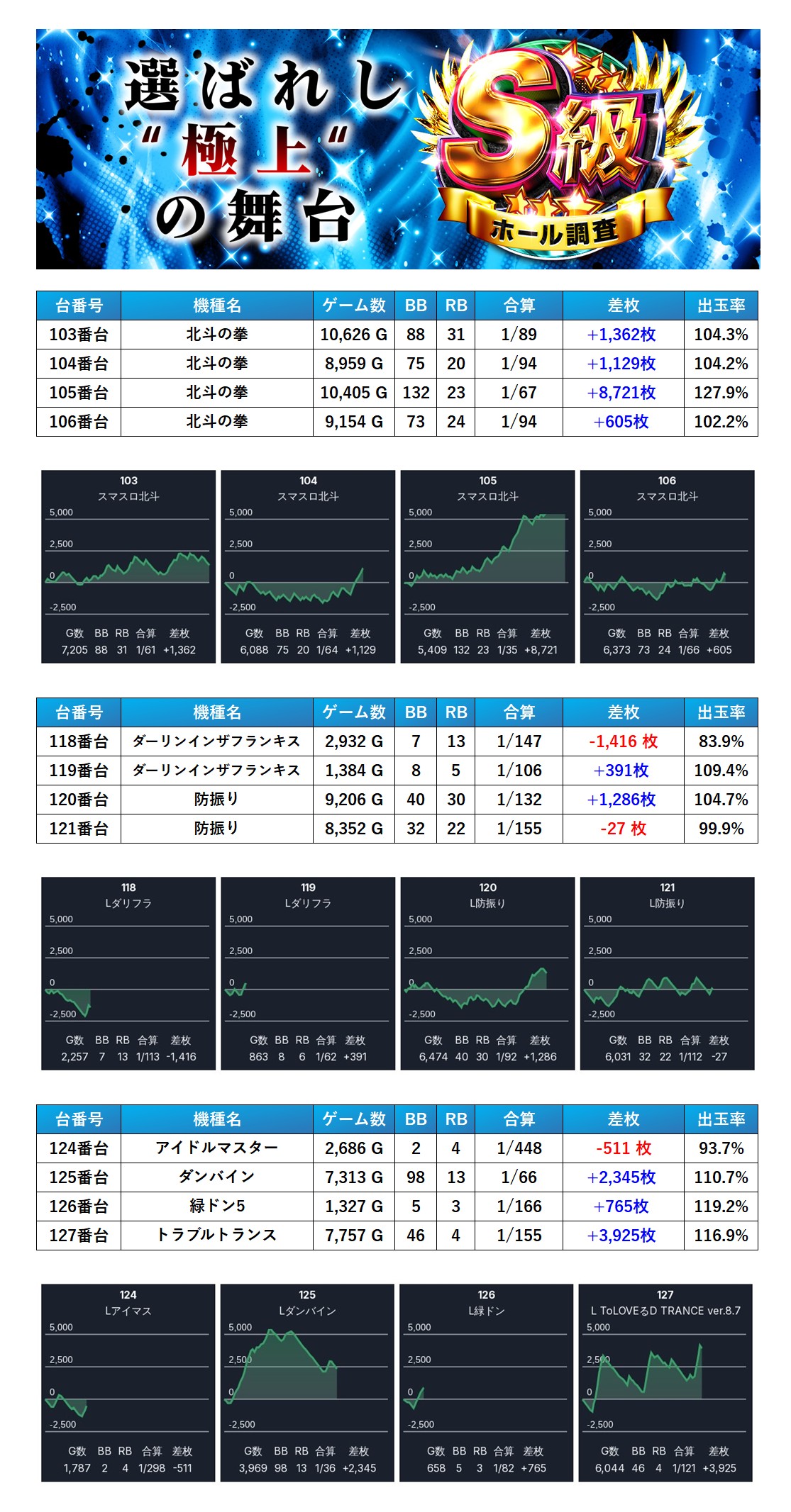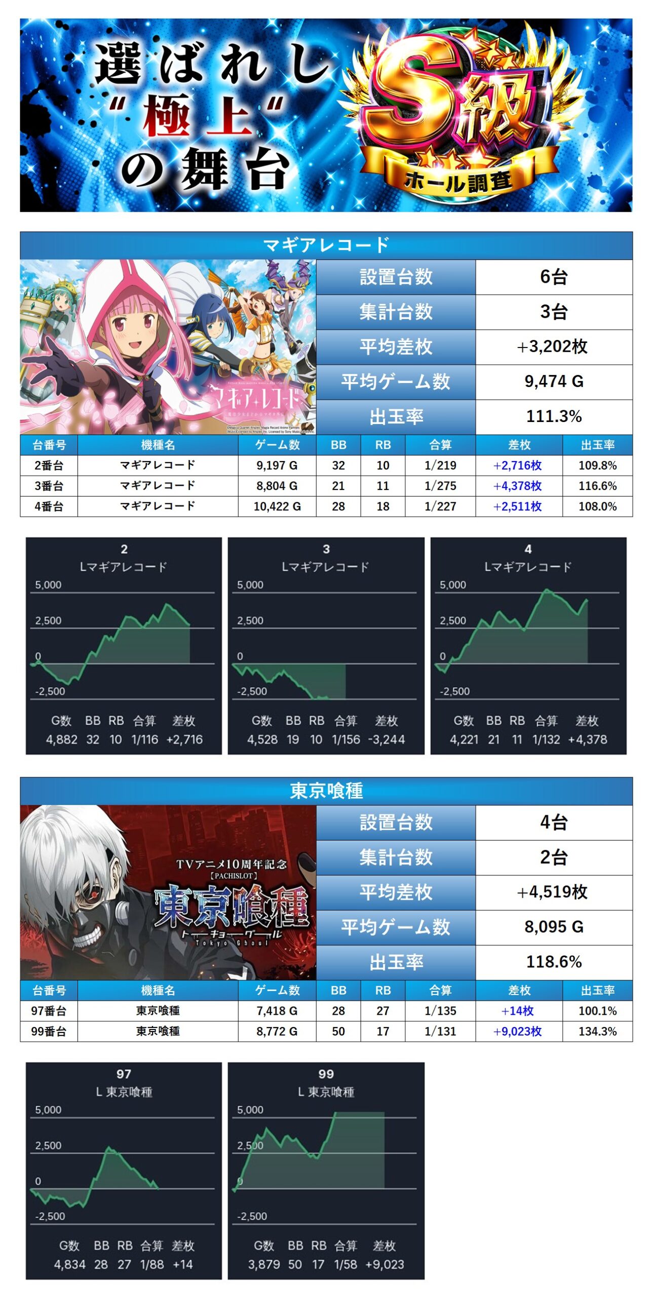 初開催となるS級ホール調査-青-は店内全体の16.2%がpick upされ、総差枚+19,725枚/平均+141枚と安定した出率で分岐超えを果たし。見事三つ星に輝いた。メイン機種を軸に質のいい仕掛けがされていた事は全体的な平均ゲーム数を見れば伺える。「メイン機種」では安定感と爆発力のある出玉を確保でき出率も115%と好調そうだ。「設置の半分が好調だった機種」ではメリハリのある仕掛けとなっていたがしっかりとプラス域を確保していた。「並び仕掛け」では4台並び3箇所と随所から確認された。次回の調査にも注目していきたい。